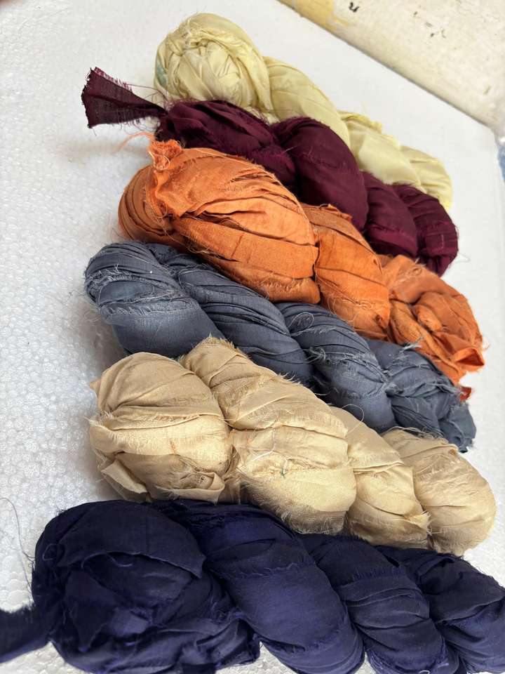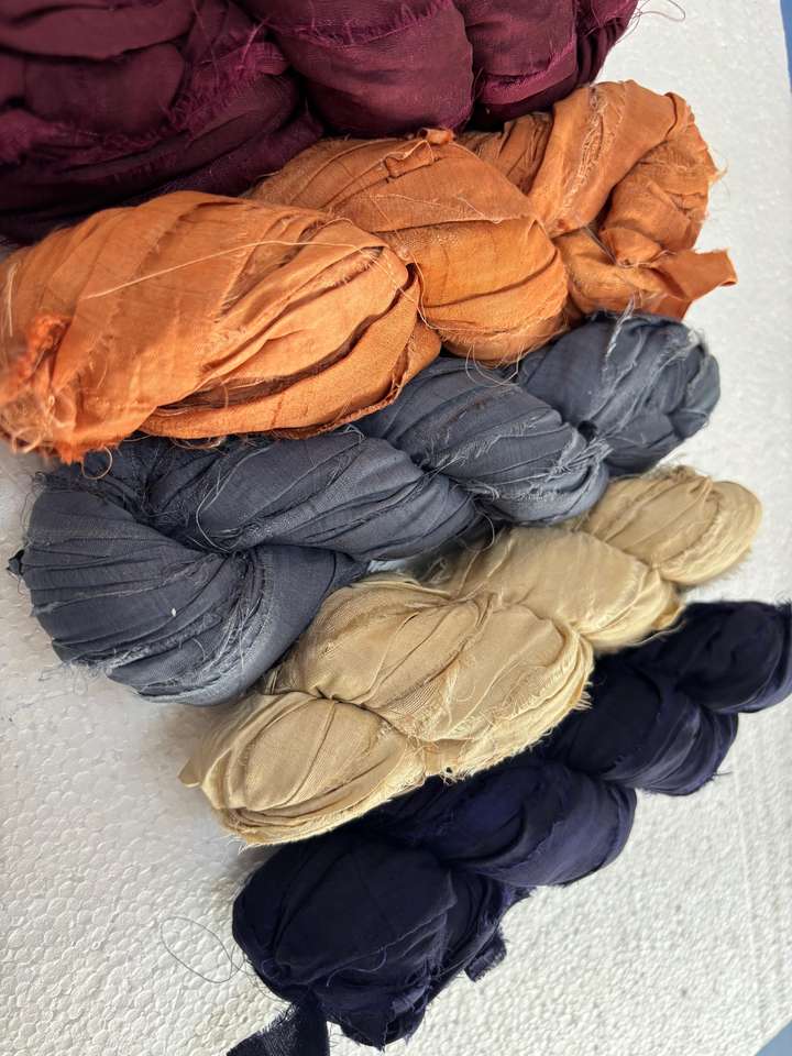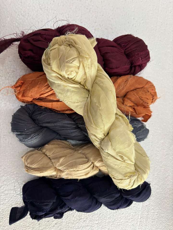 ริบบิ้นไหมซารีรีไซเคิลหลากสี ฉีกมือเป็นเส้นด้าย ใช้ในงานทำเครื่องประดับ งานทอผ้า ห่อของขวัญ งานฝีมือสไตล์โบโฮ เป็นมิตรต่อสิ่งแวดล้อม