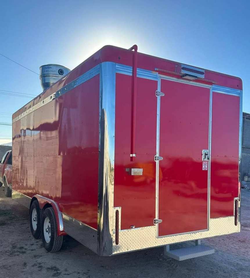 รถพ่วงขายอาหารสีแดง ขนาด 8x18 ฟุต พร้อมเครื่องทอดขนาดใหญ่ 40 ปอนด์ เตาย่าง 2 หัว ขนาด 36 นิ้ว โต๊ะนึ่ง (6 ช่อง) พร้อมลิ้นชักเลื่อน