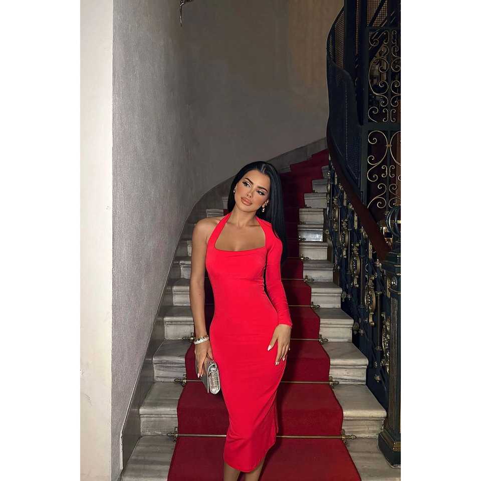 ชุดราตรีสีแดงทรงเอไลน์แขนเดียว ประดับด้วยผ้าจับจีบระยิบระยับ ประดับด้วยเลื่อมและมุก ชุดเดรสยาวสำหรับงานเลี้ยงอย่างเป็นทางการ
