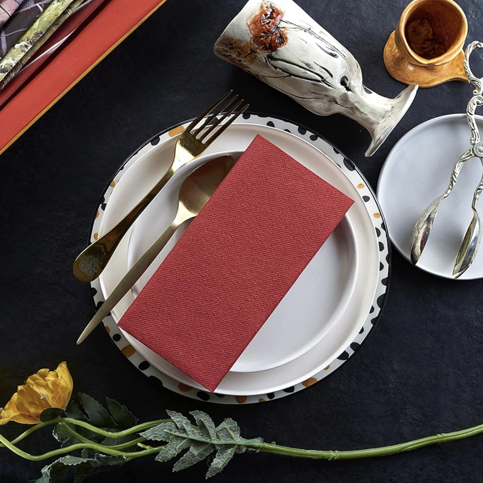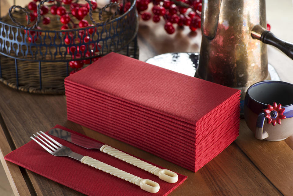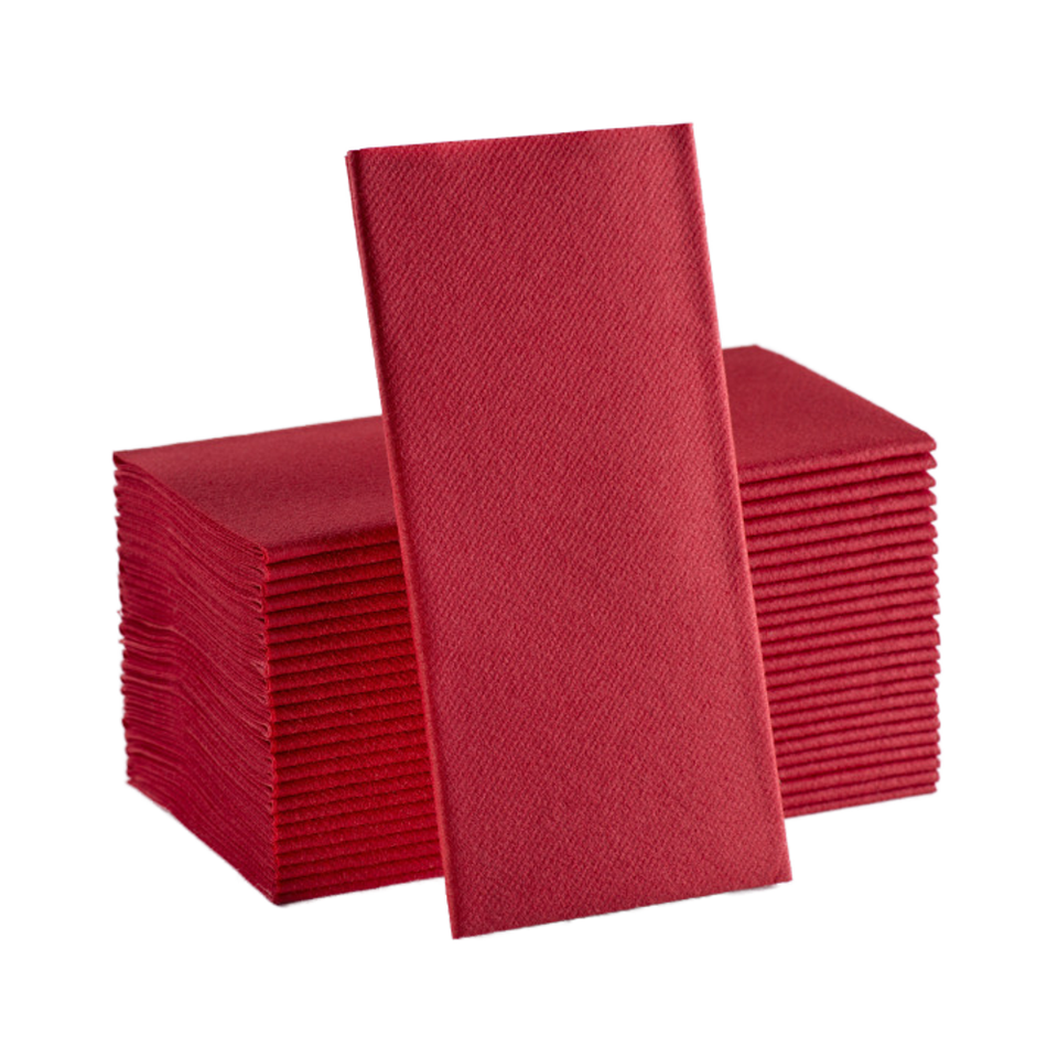 ผ้าเช็ดปากกระดาษย่อยสลายได้สีแดงสำหรับงานเลี้ยง ขนาด 16x16 นิ้ว แบบพับหนังสือ สัมผัสเหมือนผ้าลินิน ผลิตจากวัสดุเกรดอาหาร พร้อมส่งจากสหรัฐอเมริกา