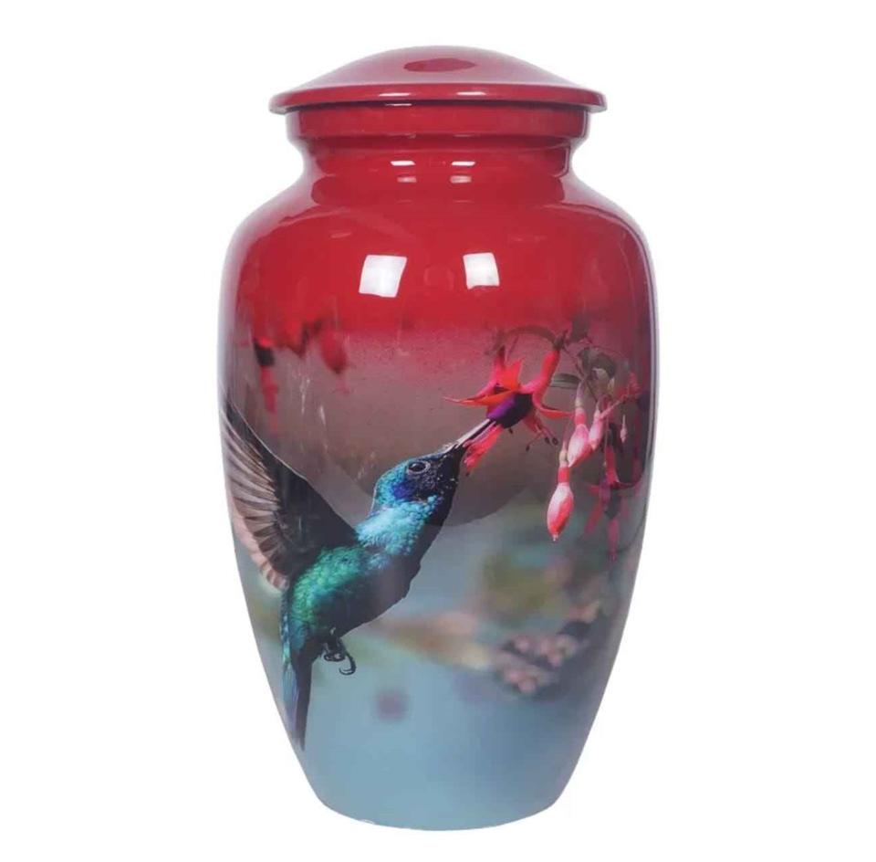โกศบรรจุอัฐิรูปนกฮัมมิงเบิร์ดสีแดงและสีน้ำเงิน พร้อมลวดลายดอกไม้และเคลือบเงา สำหรับงานรำลึกผู้ใหญ่