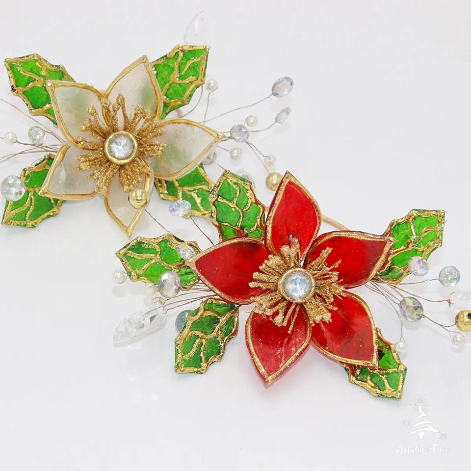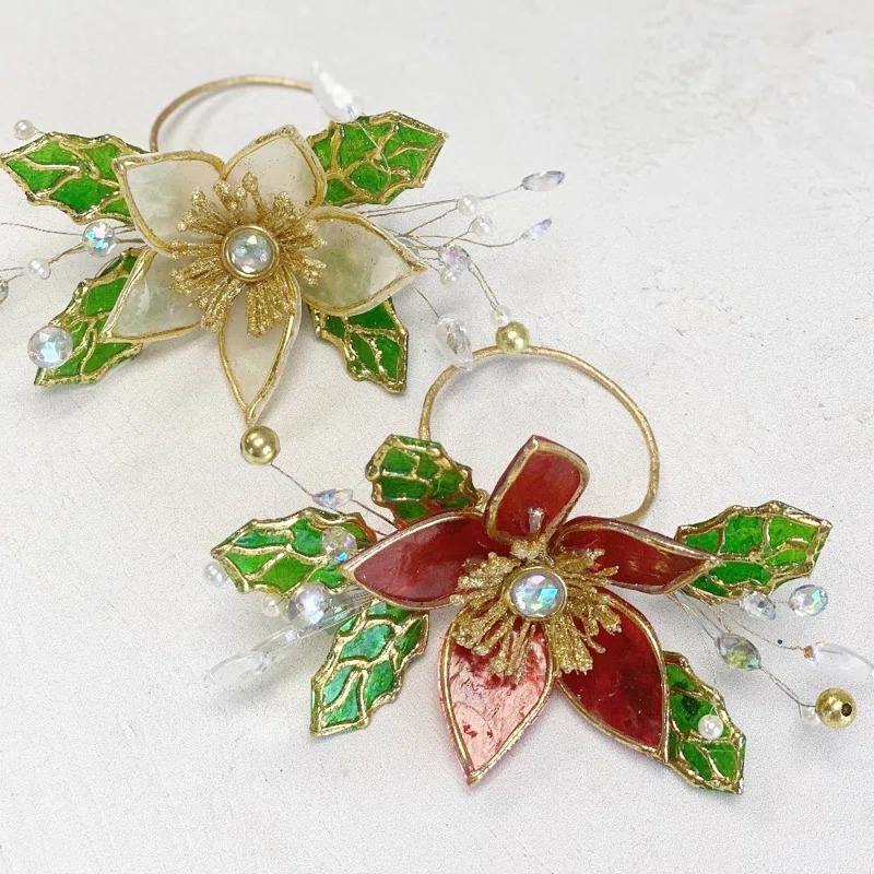 ชุดแหวนรองผ้าเช็ดปากรูปดอกไม้เปลือกหอยคาปิซสีแดงและครีม สำหรับคริสต์มาส พร้อมที่ใส่ผ้าเช็ดปากรูปดอกโป๊ยเซียนลวดทองพรีเมียม