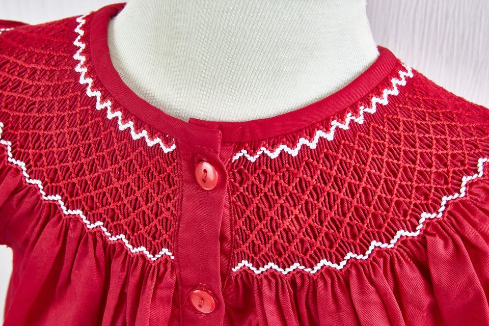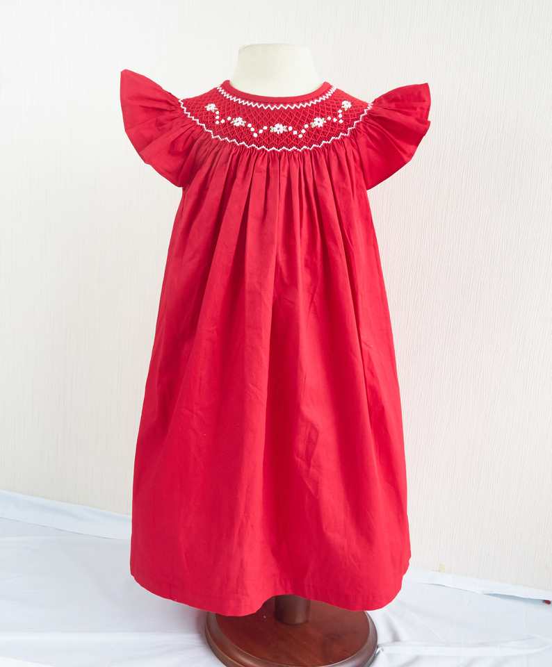 ชุดเดรสเด็กสีแดงปักลายมือพร้อมแขนระบาย | ชุดเดรสเด็กทารกปักลายสม็อกกิ้งทำมือ | เสื้อผ้าเด็กบูติกแบบ OEM