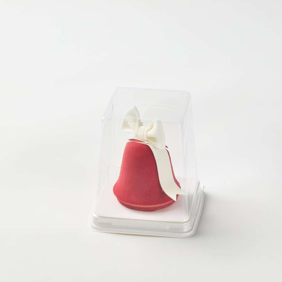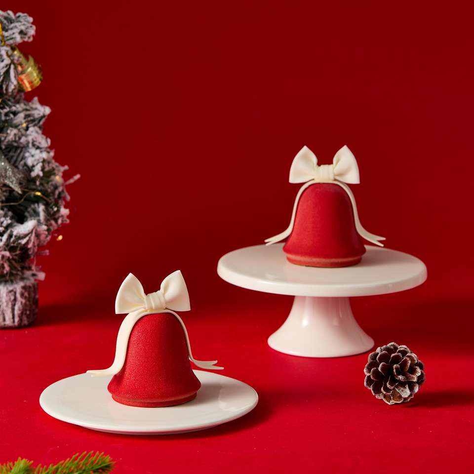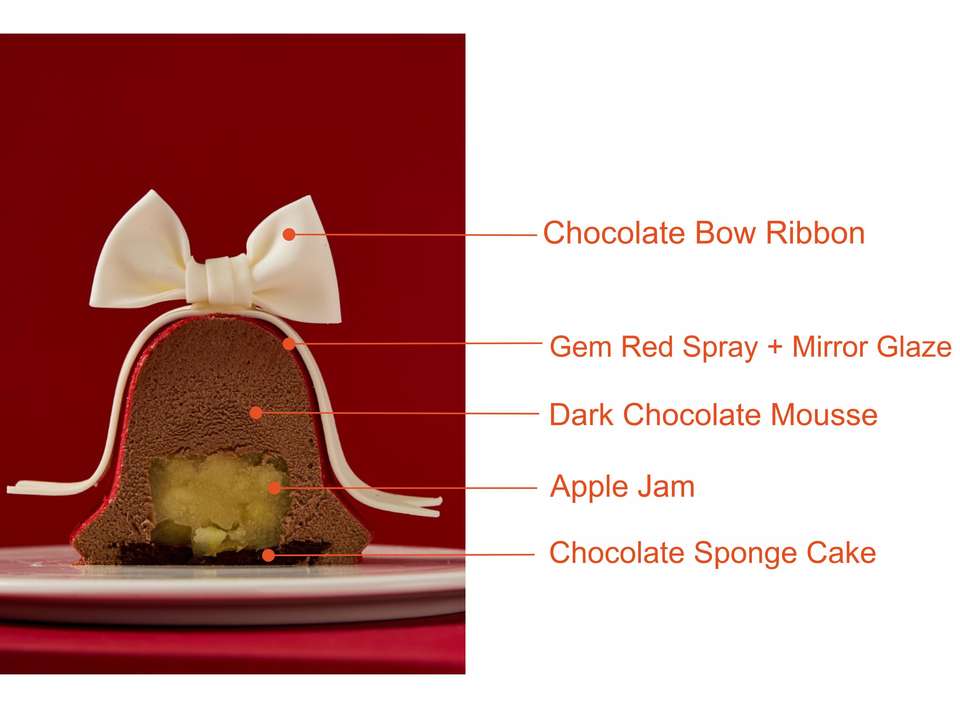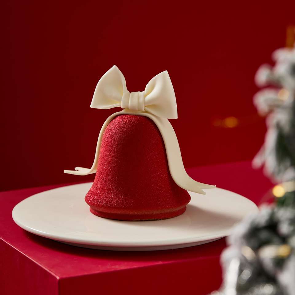 เค้กช็อกโกแลตมูสรูประฆังแดงพร้อมไส้แยมแอปเปิ้ลและโบว์ฟองดองสีขาวสำหรับคริสต์มาส
