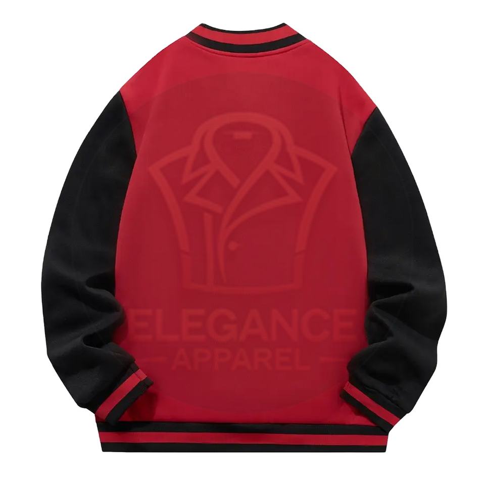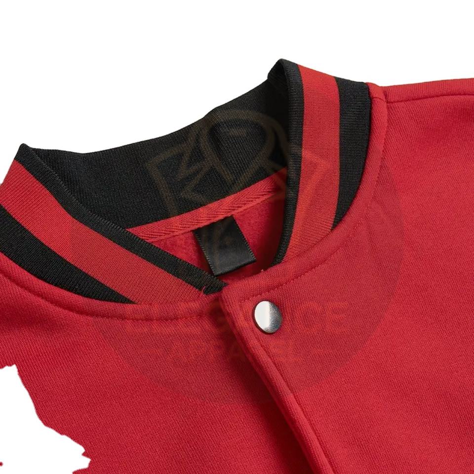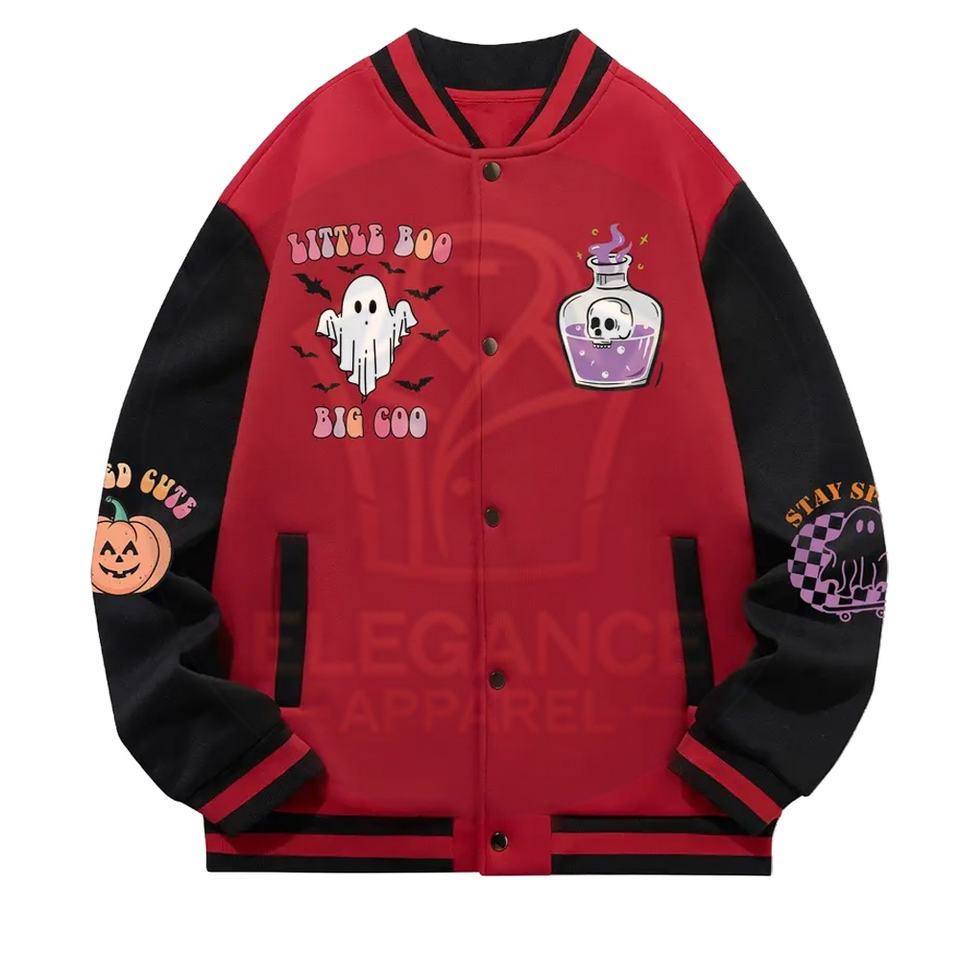บล็อกสีแดงและสีดำที่มีการออกแบบขวดแม่มดฟักทองกราฟิกแจ็กเก็ตทีมเบสบอลวิทยาลัยของตนเอง