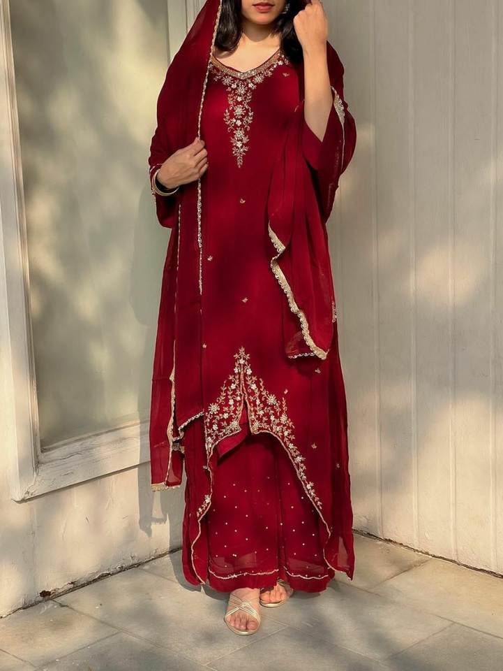 ผ้าจอร์เจียต์เทียมสีแดงดำเนื้อหนา ตัดเย็บแบบกึ่งสำเร็จรูป ทรงตรง แต่งขอบ ดีไซน์เนอร์ ซัลวาร์ คามีซ สำหรับงานปาร์ตี้ งานสันจีต ไนท์ส อีด