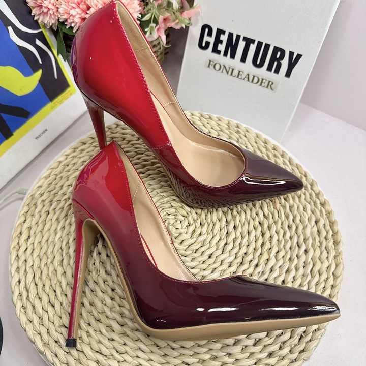 รองเท้าส้นสูงสีแดงดำไล่เฉดสี ปลายแหลม สำหรับผู้หญิง ขนาด 34-46 ส้นสูง 8 ซม. 10 ซม. 12 ซม. รองเท้าส้นเข็มแบบหรูหราสำหรับชุดทางการ รองเท้าส้นสูงเซ็กซี่