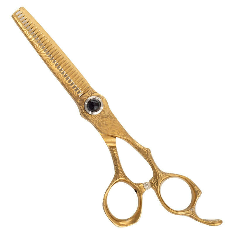 กรรไกรตัดผมใบมีดสีแดง 6 นิ้ว ลายดามัสก์สีทอง ประดับพลอยสีดำ 440C กรรไกรตัดผมมืออาชีพ