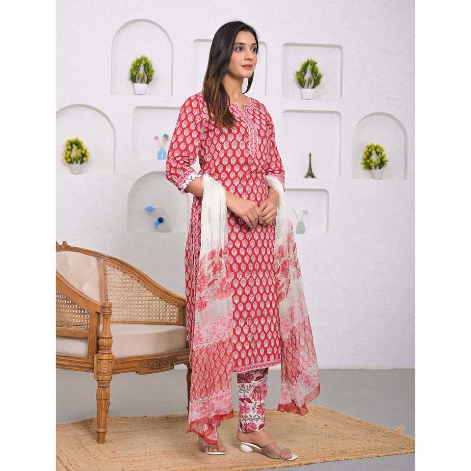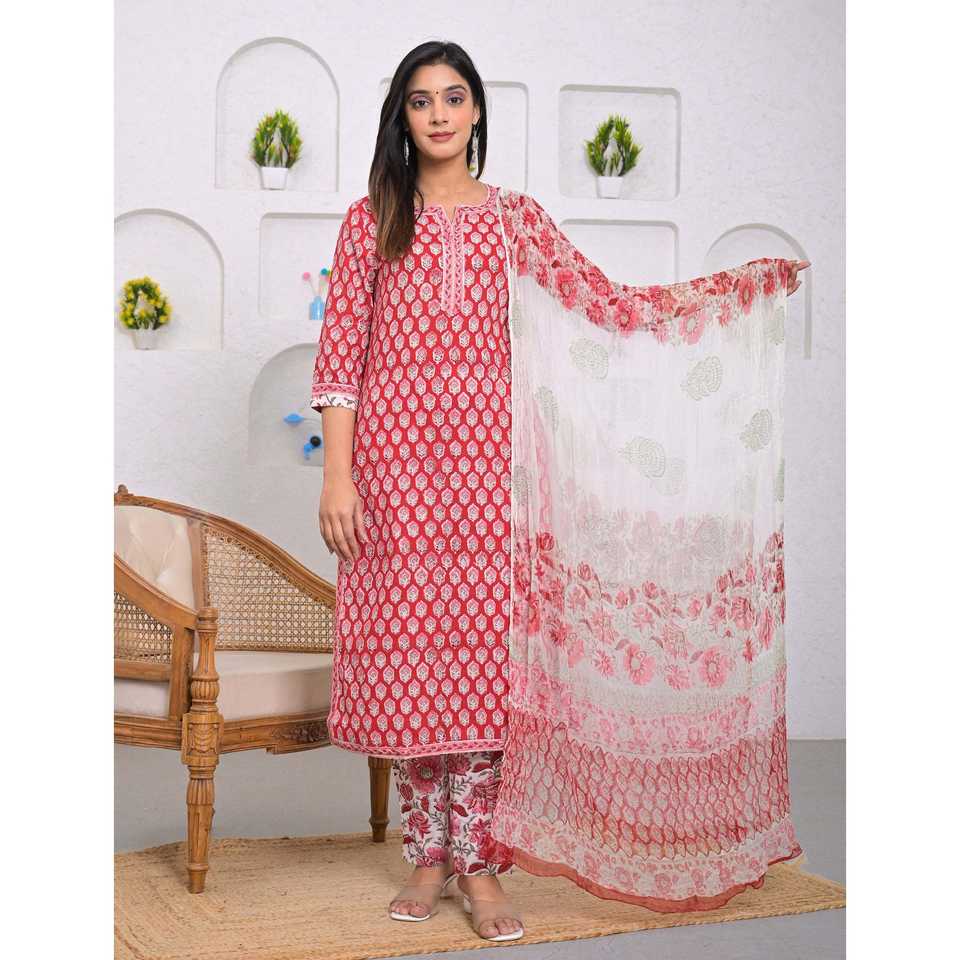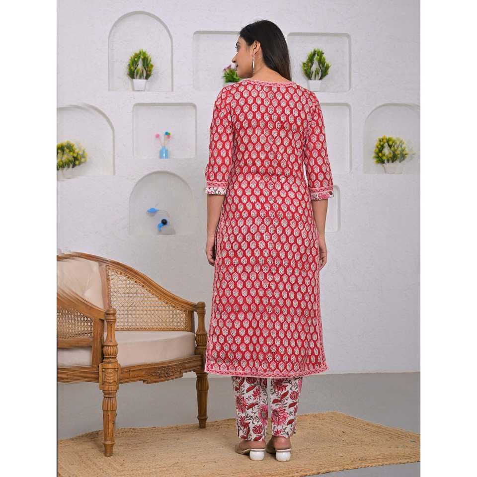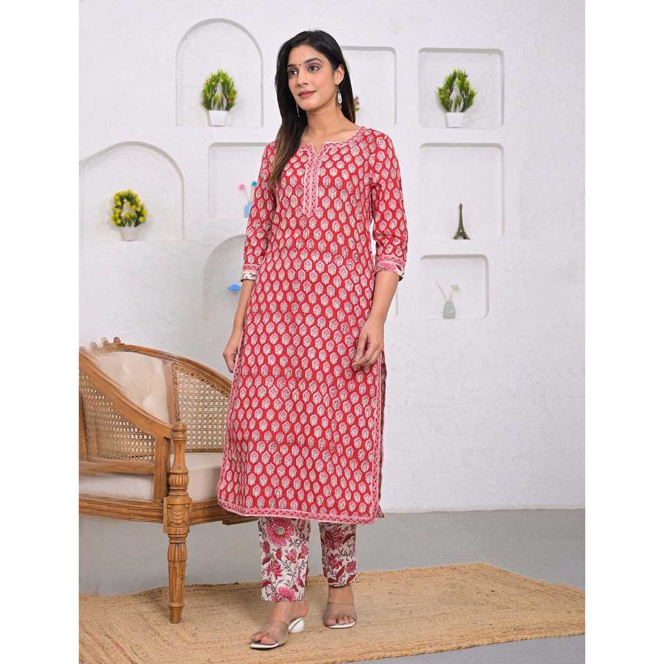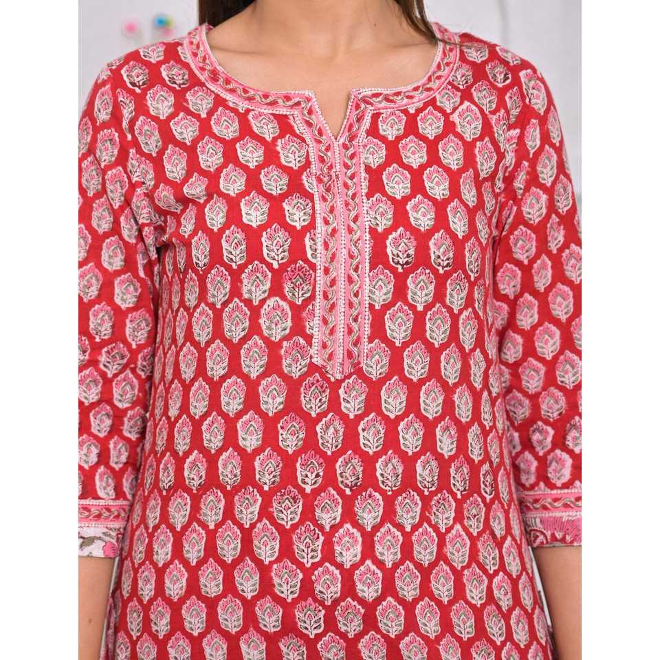ชุดกางเกงคุรตะผ้าฝ้ายพิมพ์ลายสีแดง แขนสามส่วน สำหรับใส่ในชีวิตประจำวัน