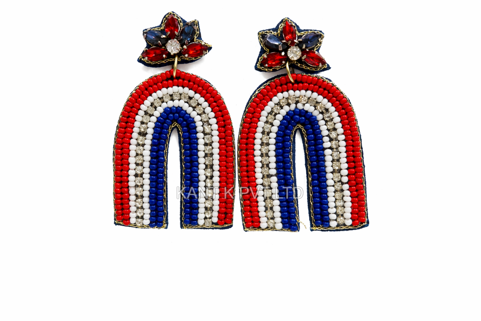 ต่างหูฟลิปฟลอปสีแดง น้ำเงิน และขาว ต่างหูแบบมีสไตล์ ต่างหูประดับลูกปัดแบบรักชาติ ต่างหูทำมือประดับลูกปัดเม็ดเล็ก