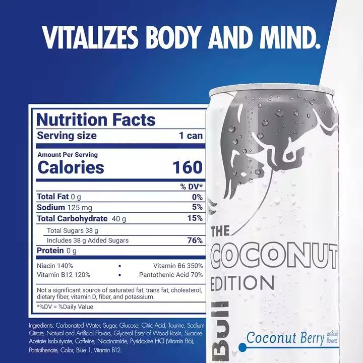 เครื่องดื่มชูกำลังจากมะพร้าวกระทิงแดงแพ็ค12ฟลอยซ์มีส่วนผสมหลักคาร์บอเนต24น้ำตาลที่ผลิตในประเทศเยอรมนี