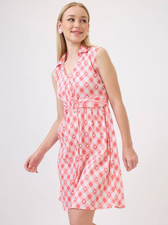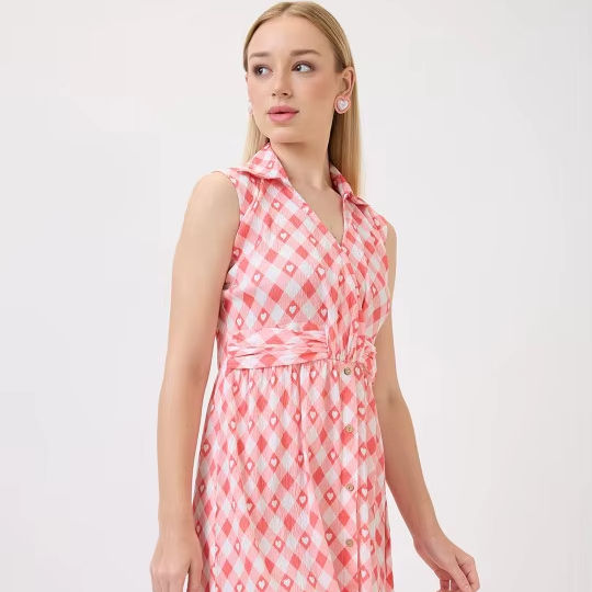 เดรสทรงเอลายตารางสีแดง คอวี แขนกุด ผ้าจอร์เจตต์ ชายกระโปรงบาน ความยาวปานกลาง เป็นมิตรต่อสิ่งแวดล้อม สำหรับผู้หญิง