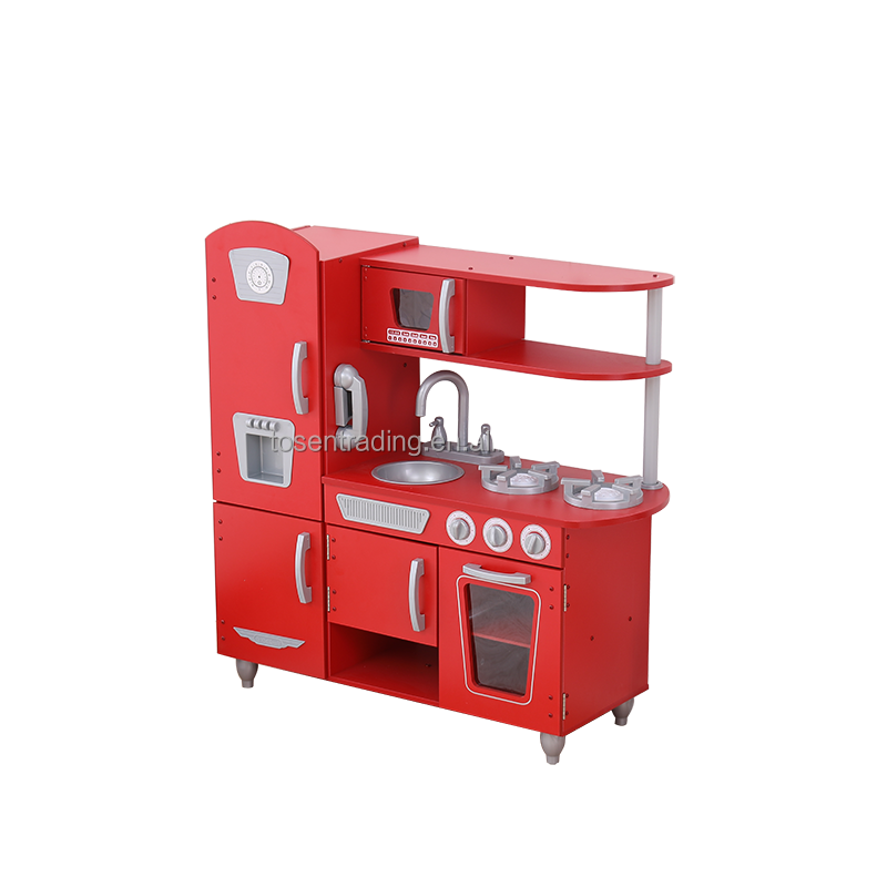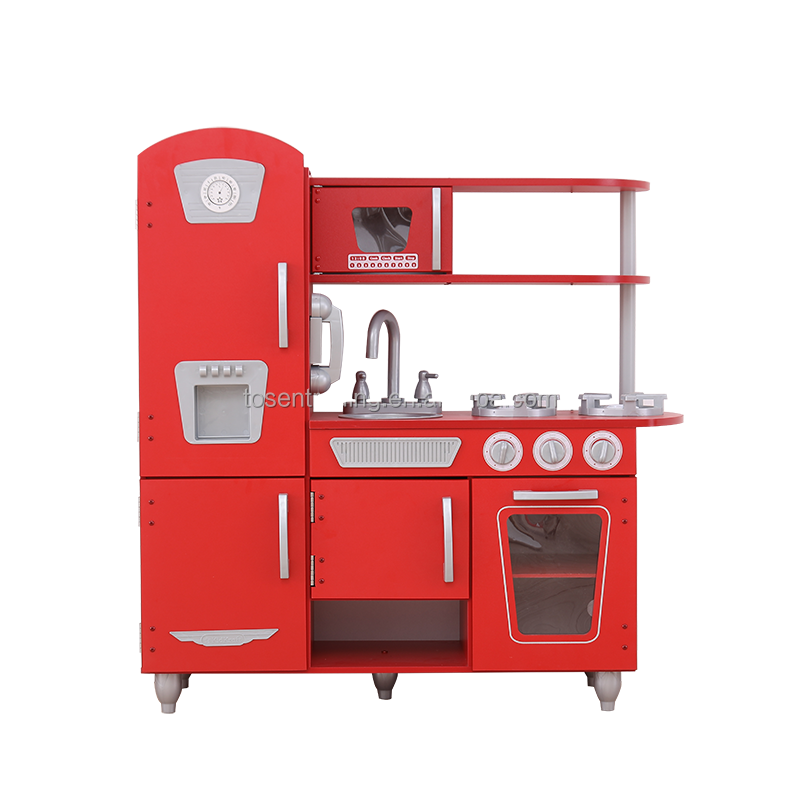 ครัวไม้สีแดงสไตล์วินเทจสำหรับเด็กเล่น พร้อมเครื่องทำน้ำแข็ง โทรศัพท์ ก๊อกน้ำ อ่างล้างจาน เตา และเตาอบ