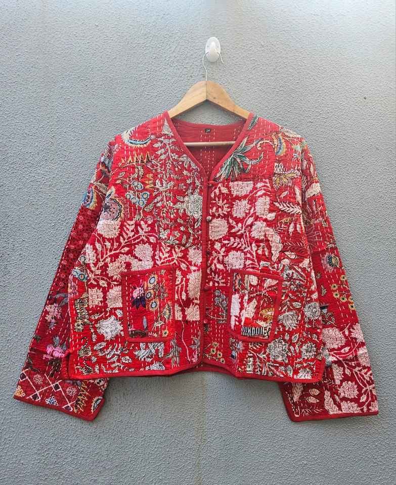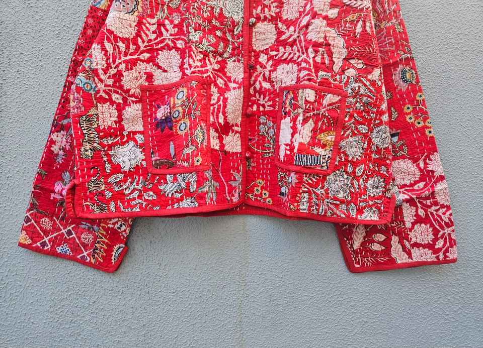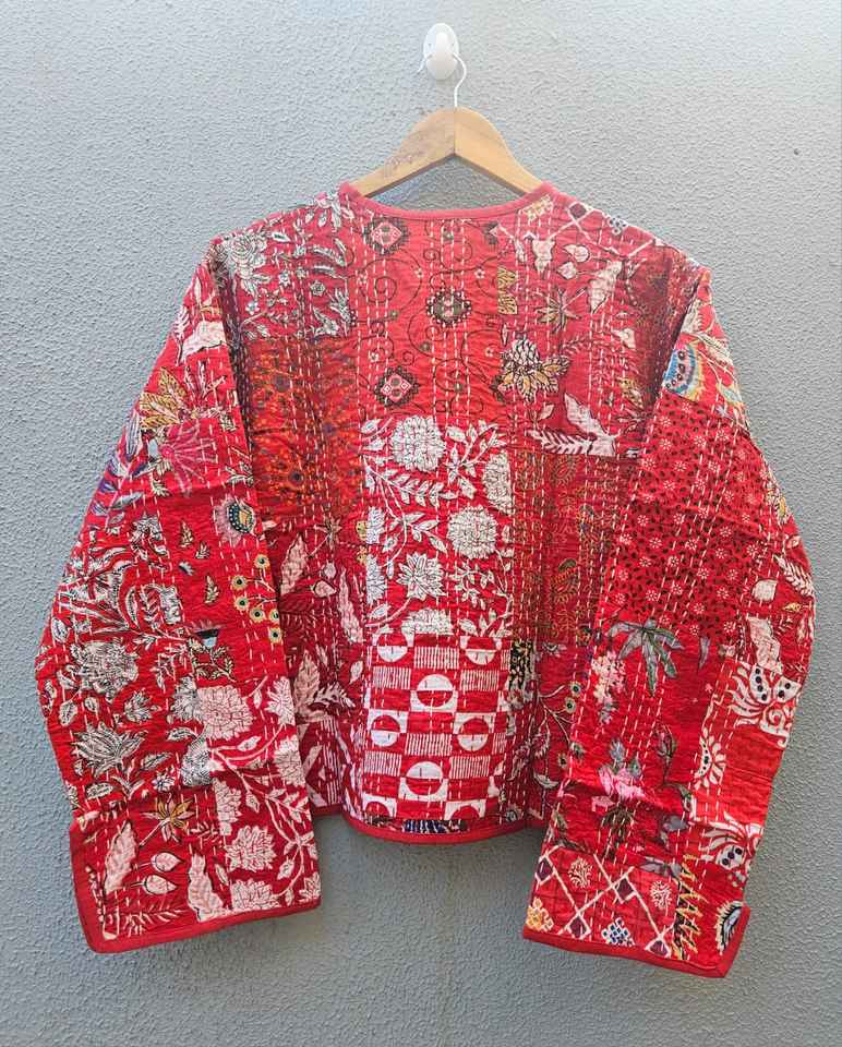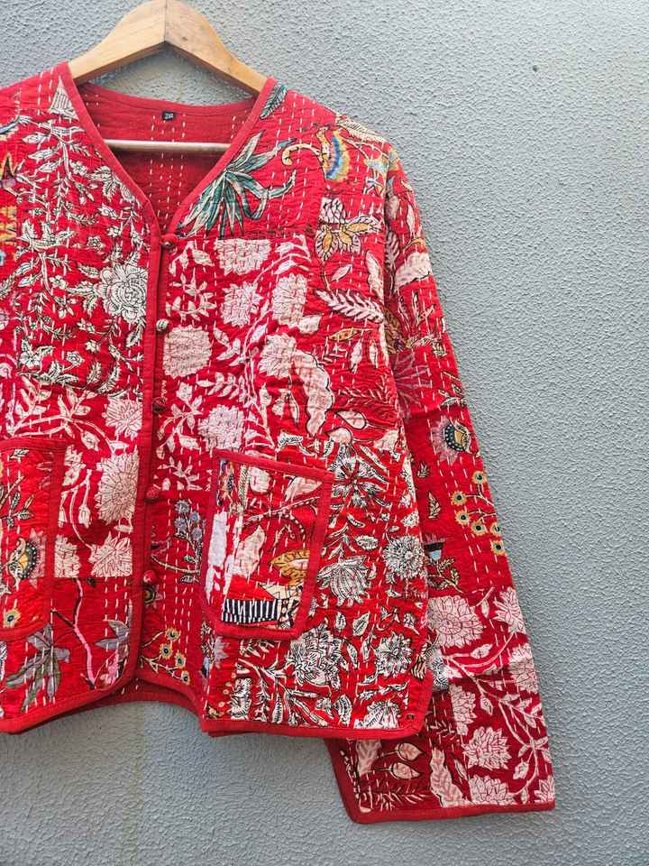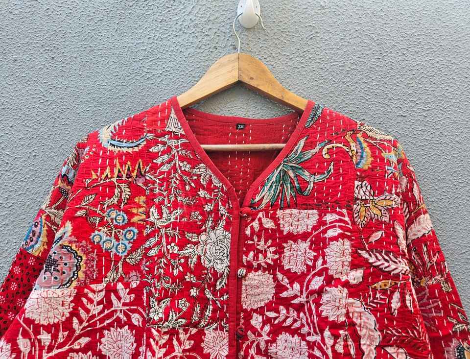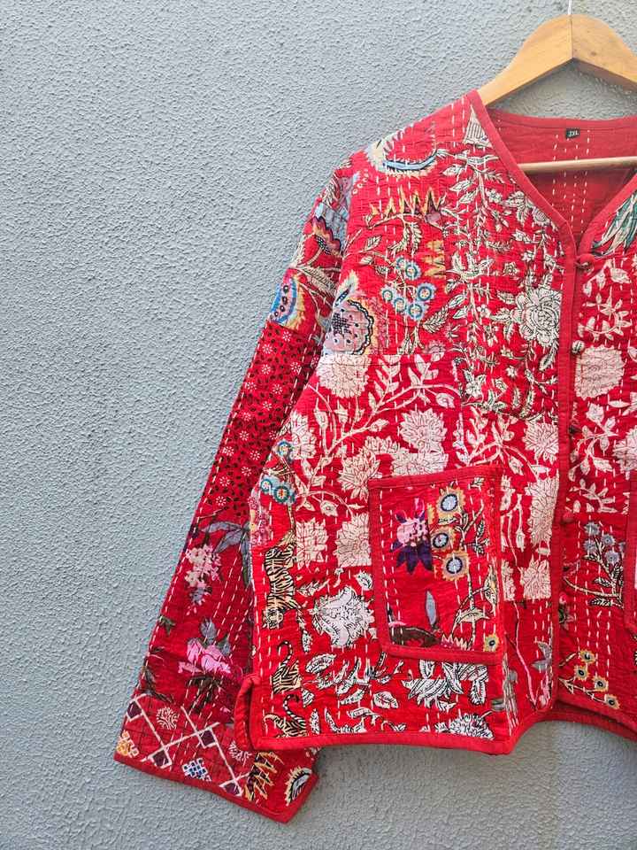 เสื้อแจ็คเก็ตผ้าฝ้ายปะติดปะต่อสีแดงพิมพ์ลายดอกไม้ งานแฮนด์เมด สไตล์อินเดีย บล็อกพิมพ์ ลายโบโฮ สำหรับผู้หญิง เสื้อโค้ทฤดูหนาว