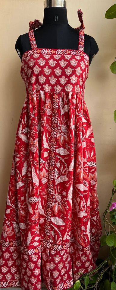 เดรสผ้าฝ้ายสีแดงขนาดเล็กลายดอกไม้คอเสื้อทรงสี่เหลี่ยมปรับได้เดรสสไตล์อินเดียมีกระเป๋ายาว