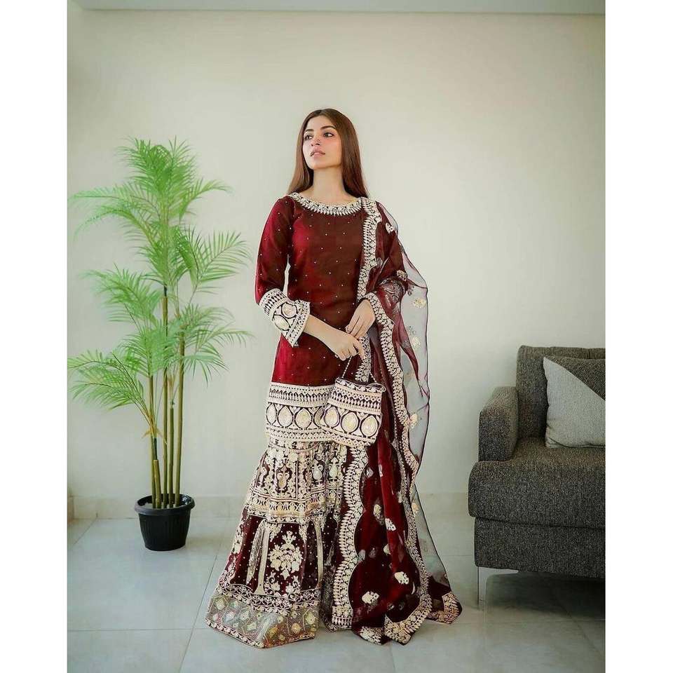 ชุดเสื้อท็อปผ้าจอร์เจตต์สีแดง ดีไซน์เนอร์ ตกแต่งงานปักเพชรแบบกระจก พร้อมกางเกงชาราร่าและผ้าคลุมไหล่