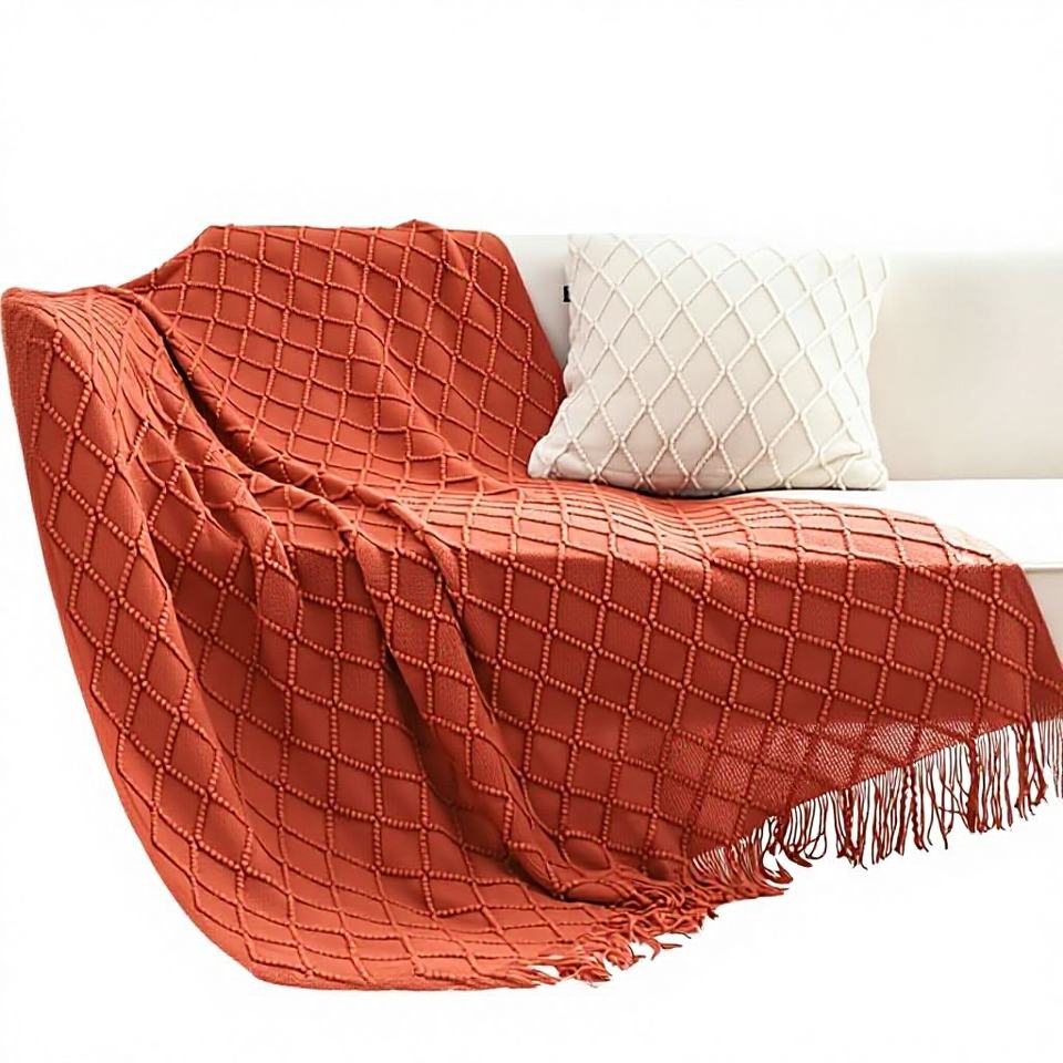 ผ้าห่มถักลายเพชรแดงพร้อมพู่ห้อยนุ่มสบายตกแต่งเตียงโซฟาสำหรับห้องนั่งเล่นโซฟารุ่น D0100H5UUN2