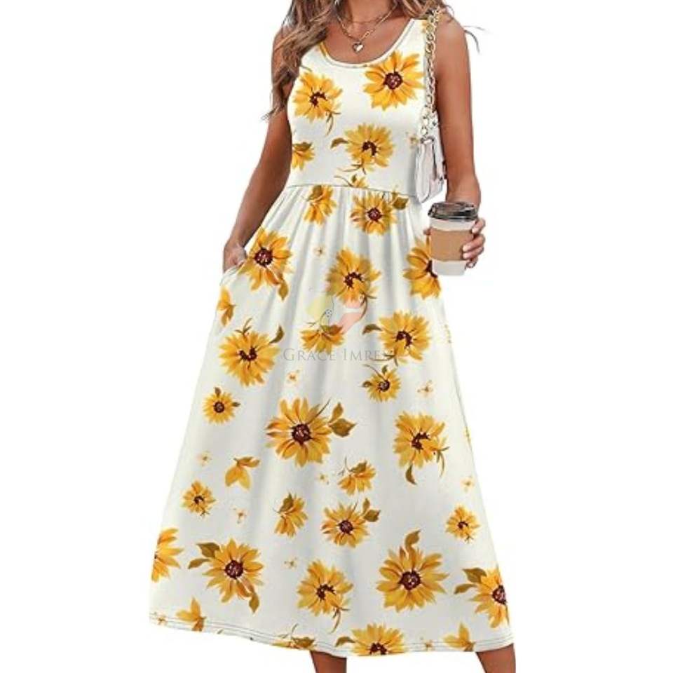เดรสยาวลายดอกดิ๊ซสีแดง แขนกุด สไตล์ลำลอง สำหรับฤดูร้อน มีกระเป๋าข้าง ผ้าระบายอากาศ แฟชั่นผู้หญิง รับผลิตตามแบบ OEM