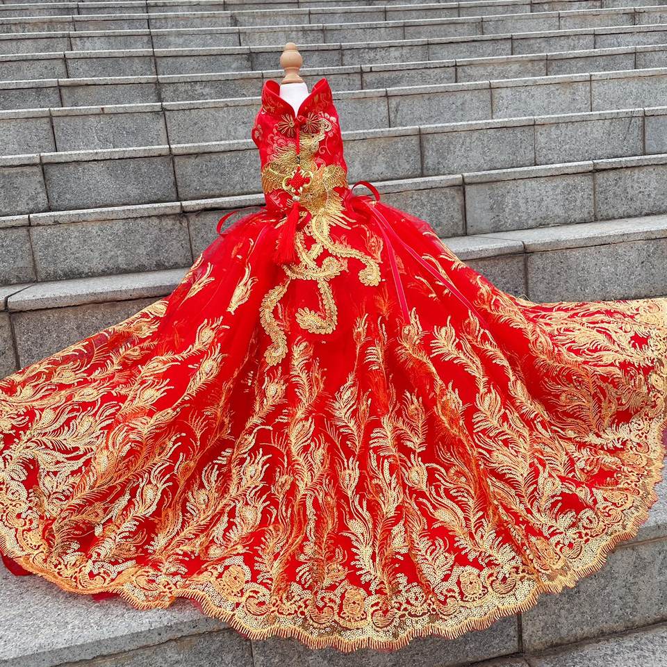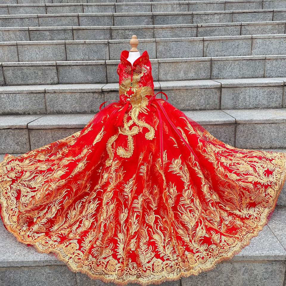 ชุดกี่เพ้าลายมังกรแดงและลวดลายมงคลพร้อมชายกระโปรงยาว ชุดเดรสสัตว์เลี้ยงน่ารักลายหมีน้อยแบบออริจินัลสำหรับแมวและสุนัข