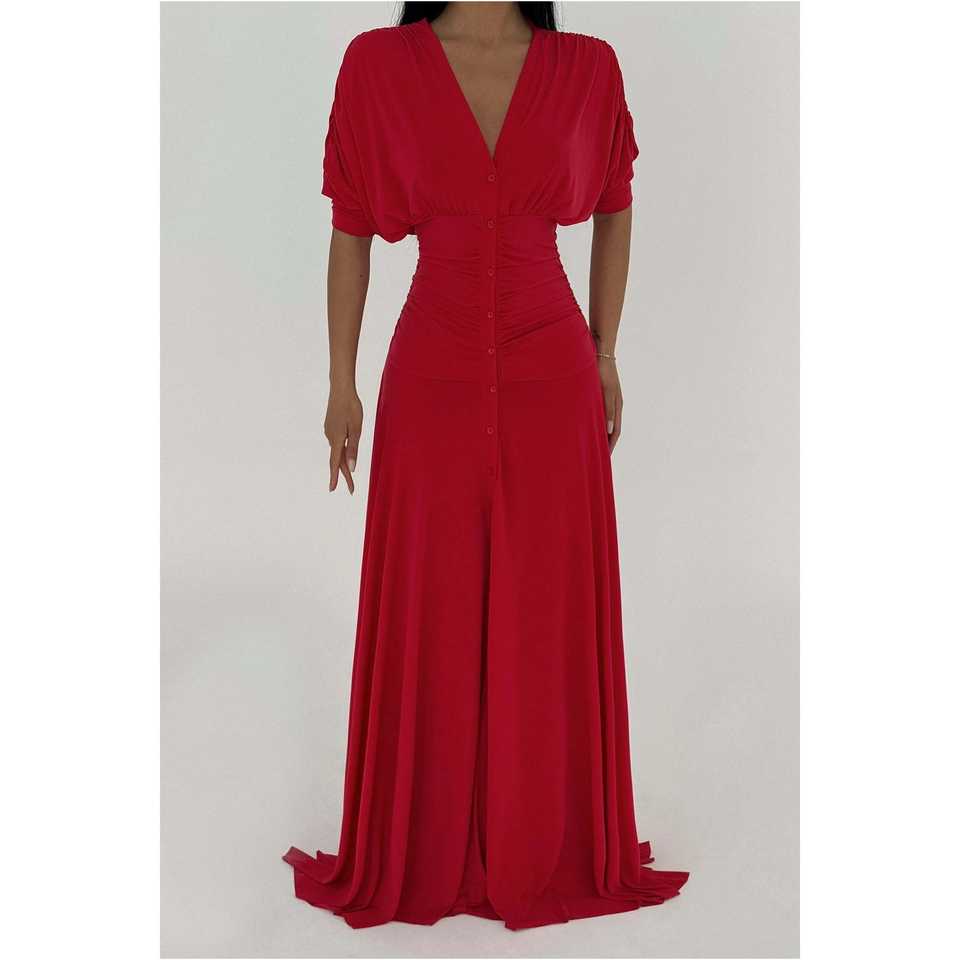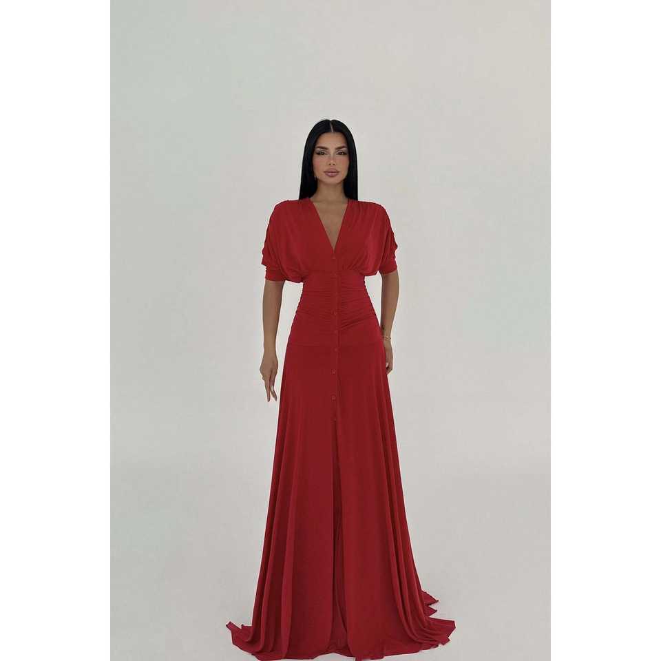 Red Elijah Long Button-Down Empire Waistline A-Line Women's Dress High Collar Simple Style for Weddings Banquets XS Floor-Length