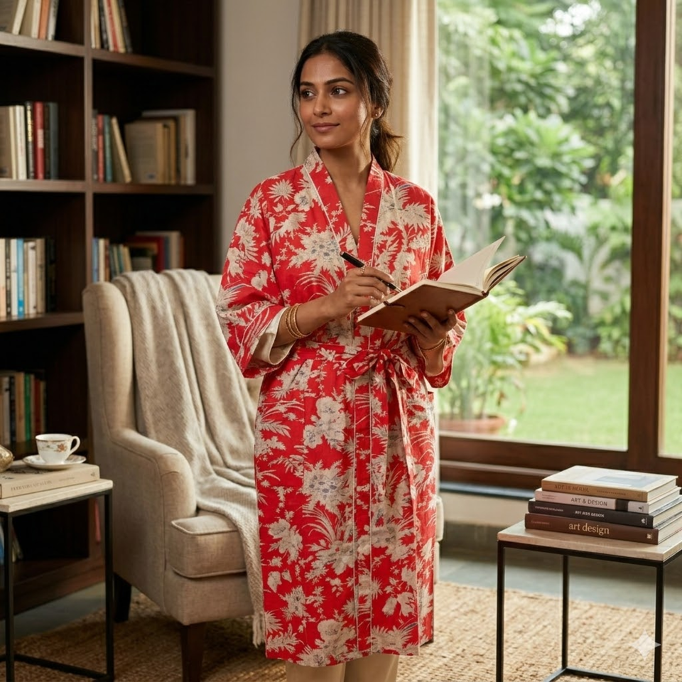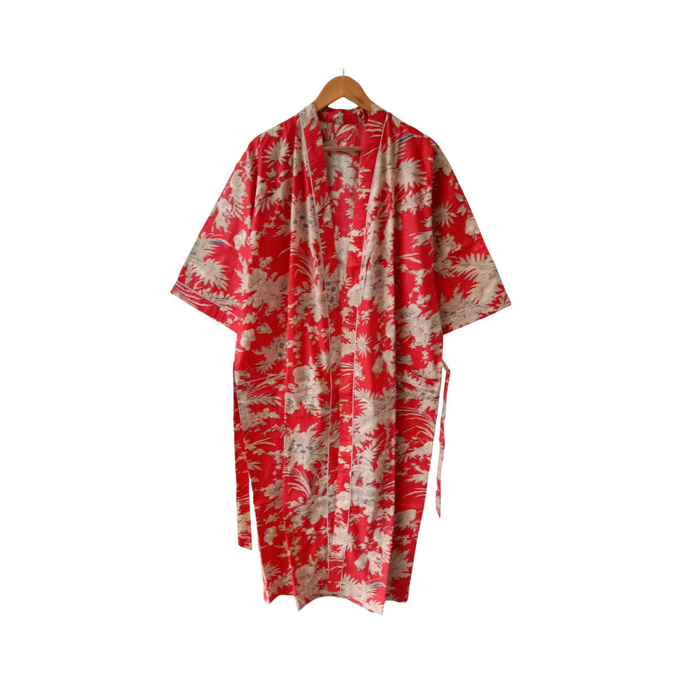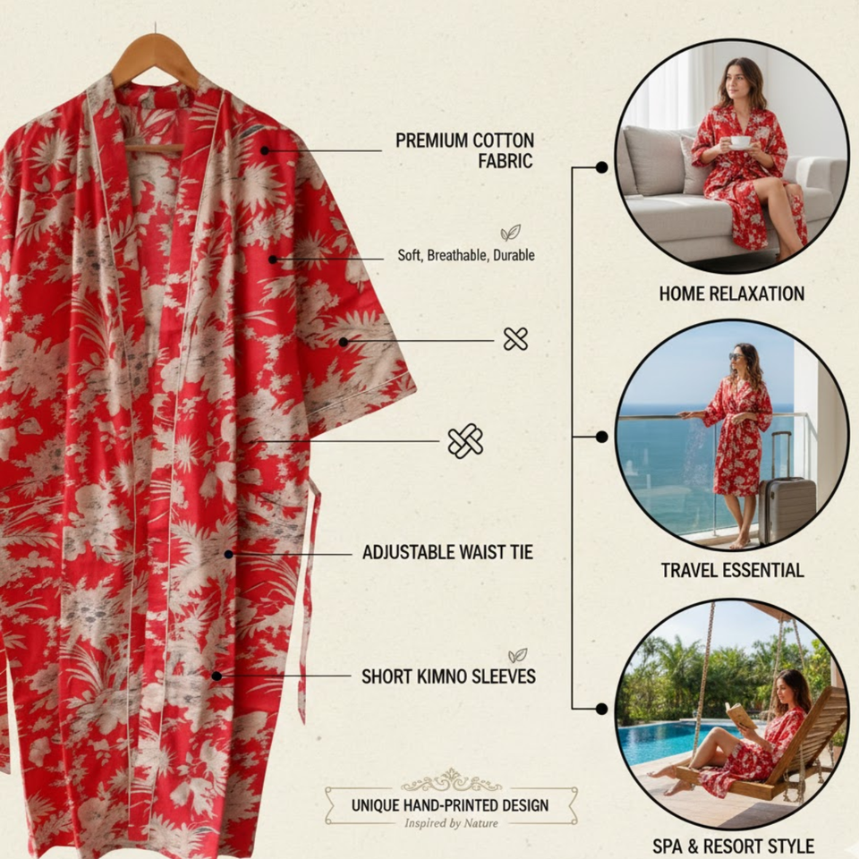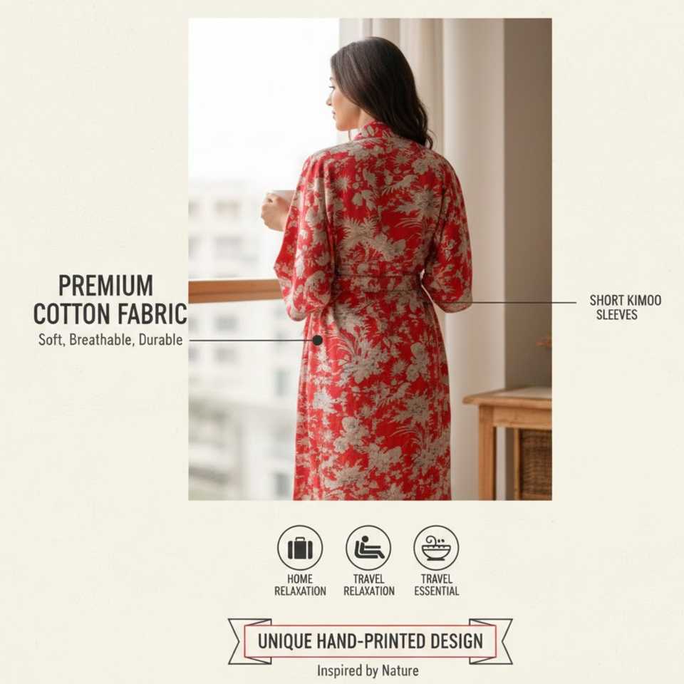 Red Floral Cotton Kimono Robe Long V Neck Nightwear With Drawstring Pocket Women Long Sleeve Loungewear Premium Maria Garments