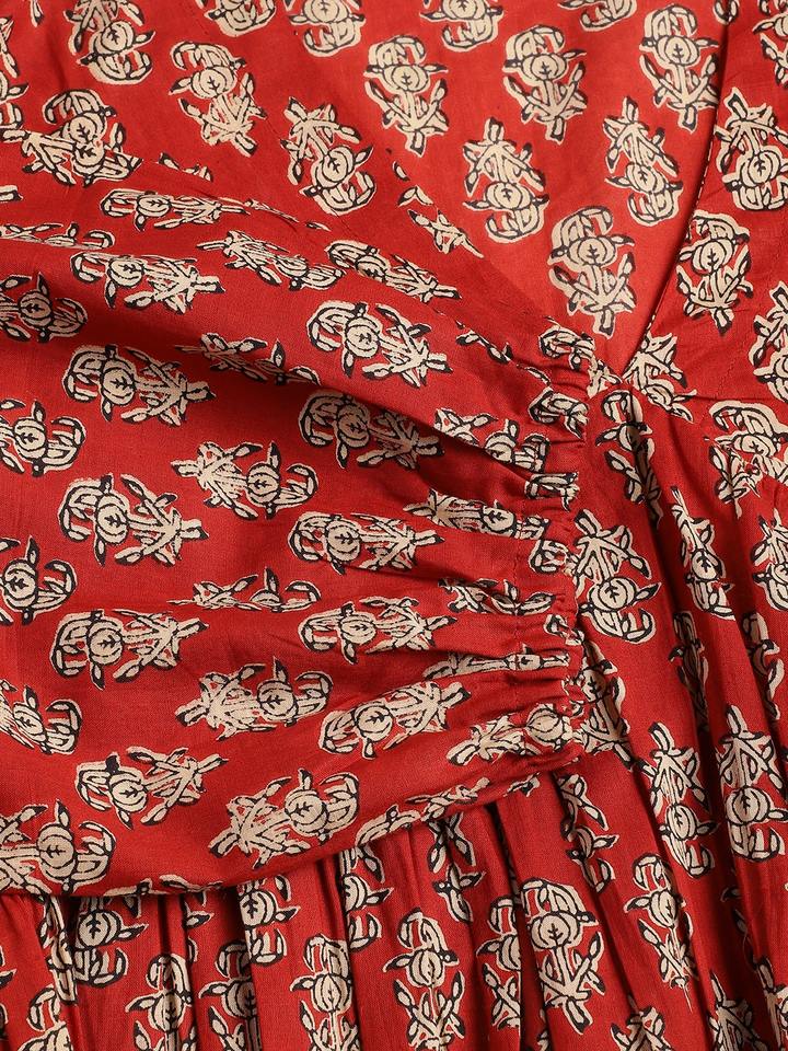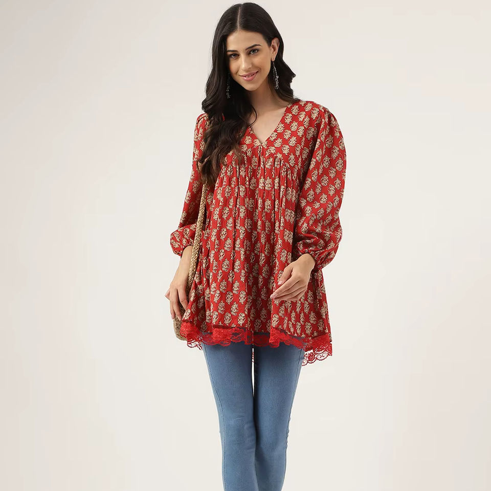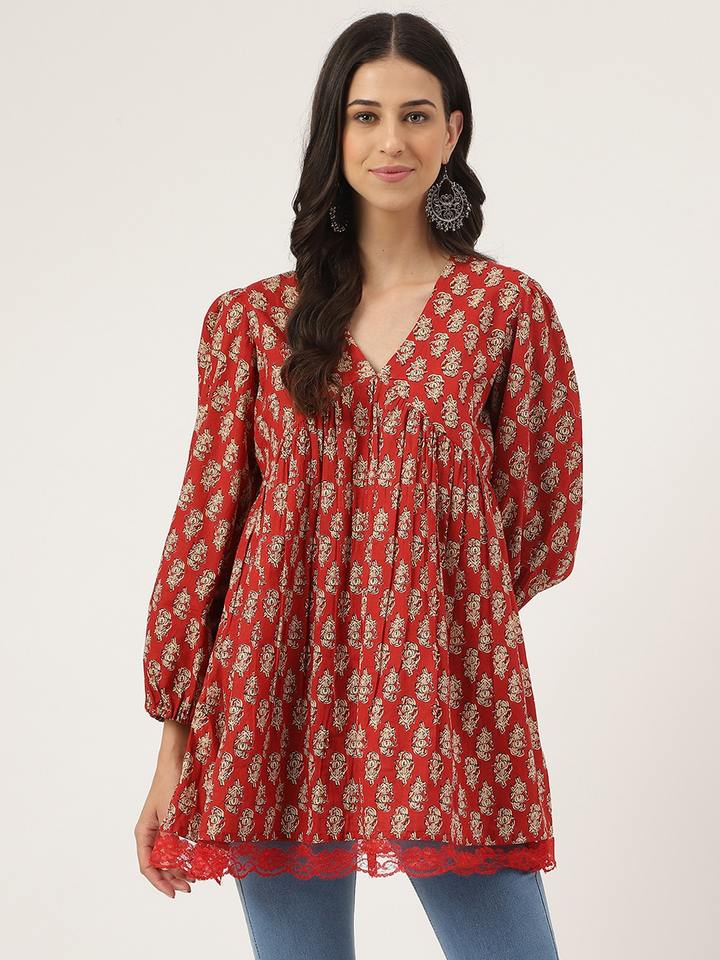 เสื้อทูนิคพิมพ์ลายดอกไม้สีแดงสำหรับผู้หญิง ผ้าฝ้ายแท้ สไตล์เปปลัม เคอร์ตี งานแฮนด์เมด เสื้อผ้าชาติพันธุ์