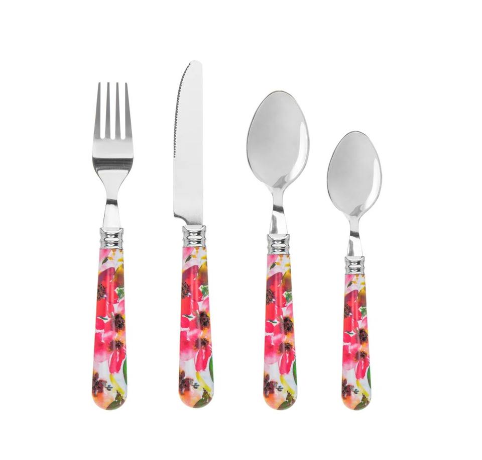 ชุดมีดหัวสีเงินพิมพ์ลายดอกไม้สีแดงพร้อมอุปกรณ์บนโต๊ะอาหารสแตนเลสสำหรับโต๊ะอาหารบ้านร้านอาหารและโรงแรม