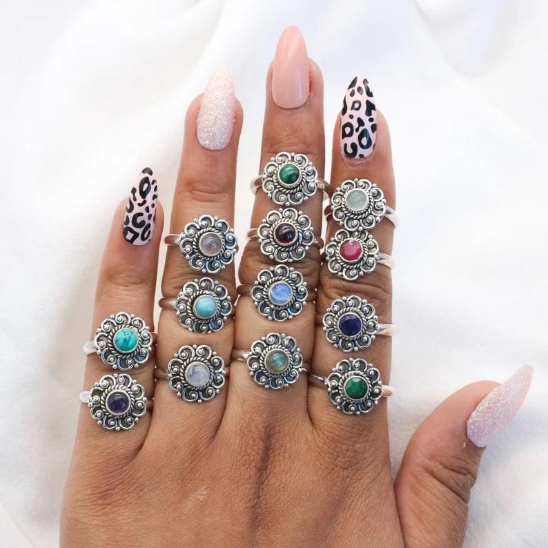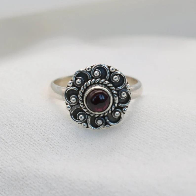 แหวนโกเมนสีแดง925ลายดอกไม้เงินสเตอร์ลิงทำด้วยมือเป็นของขวัญสำหรับเธอ