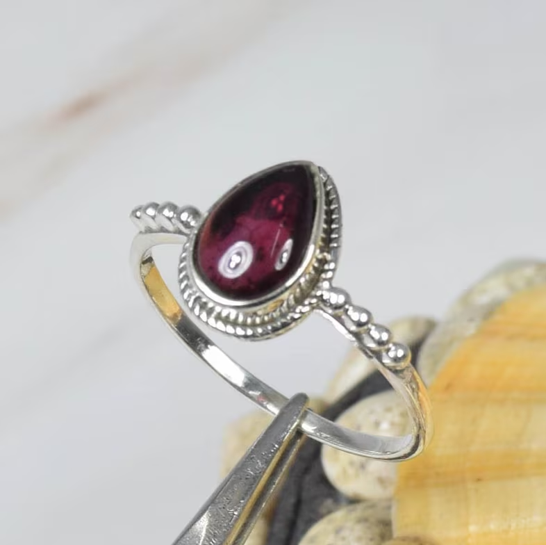 แหวนพลอยโกเมนสีแดง925เงินสเตอร์ลิงเครื่องประดับแฮนด์เมดดีไซน์แบบแฮนด์เมดพร้อมพลอยรูปทรงลูกแพร์สำหรับเป็นของขวัญวันครบรอบ