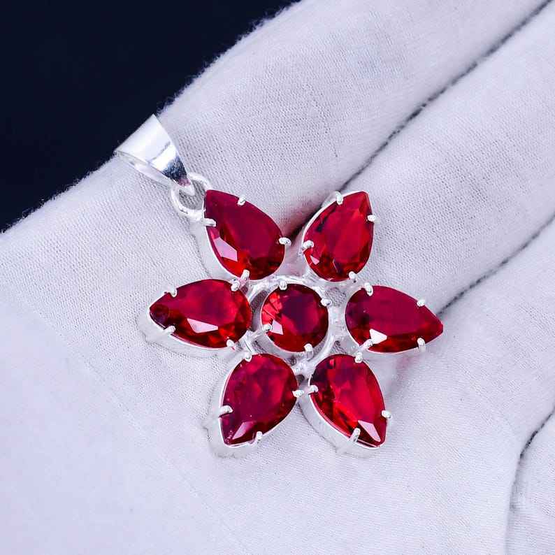 จี้รูปดอกไม้โกเมนสีแดง เครื่องประดับเงินแท้สไตล์โบฮีเมียน สร้อยคอพลอยทำมือสำหรับผู้หญิง ขายส่ง