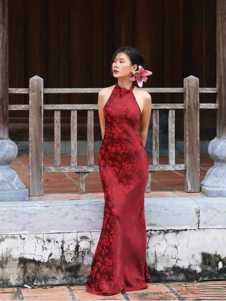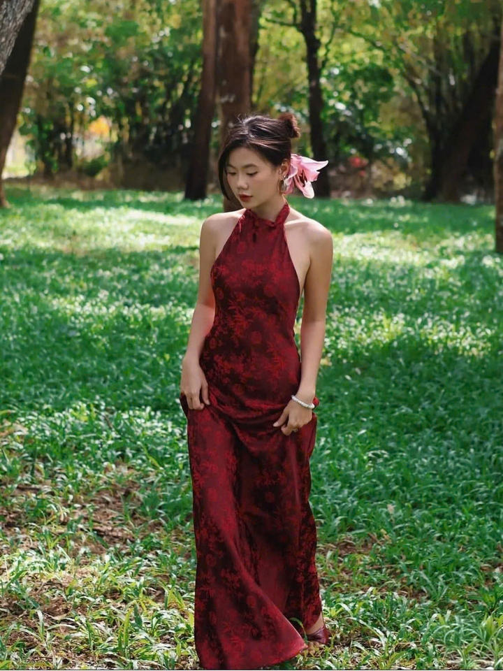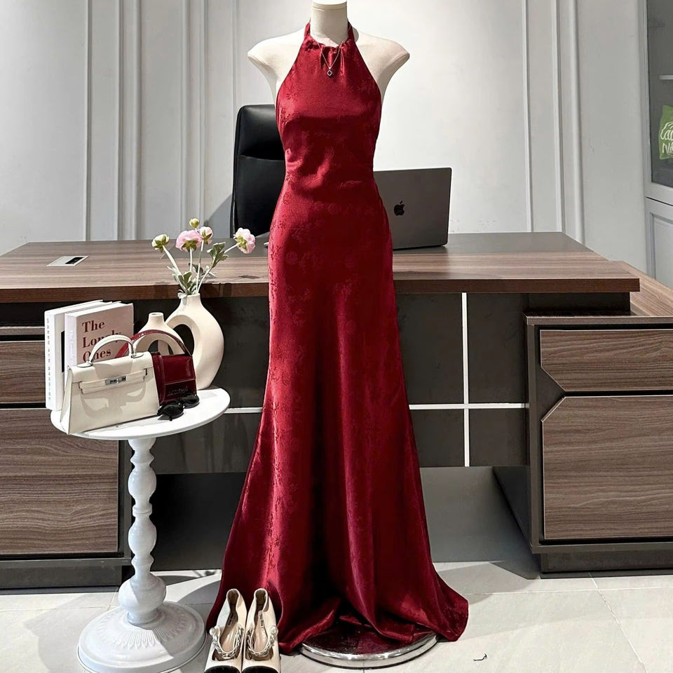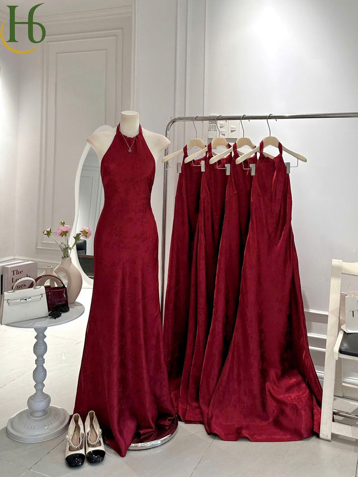เดรสยาวคอ halter สีแดง ผ้า jacquard เดรสคอ halter ผ้าซาติน jacquard แขนกุด ทรงเอไลน์ สง่างาม สวยหวาน ผ้าโพลีเอสเตอร์ แฟชั่น
