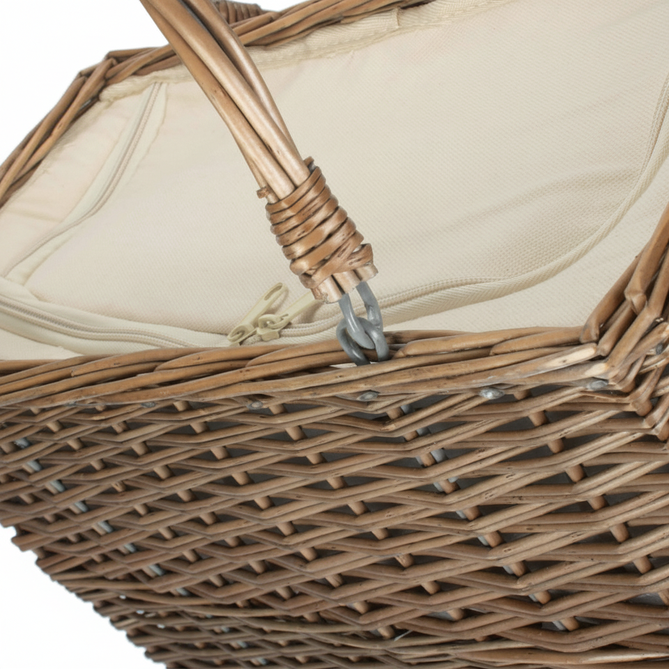 ตะกร้าปิกนิกและกระเป๋าสีแดงพร้อมช่องเก็บความเย็นและเคลือบผิวแบบโบราณ