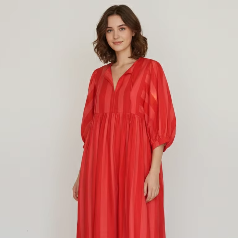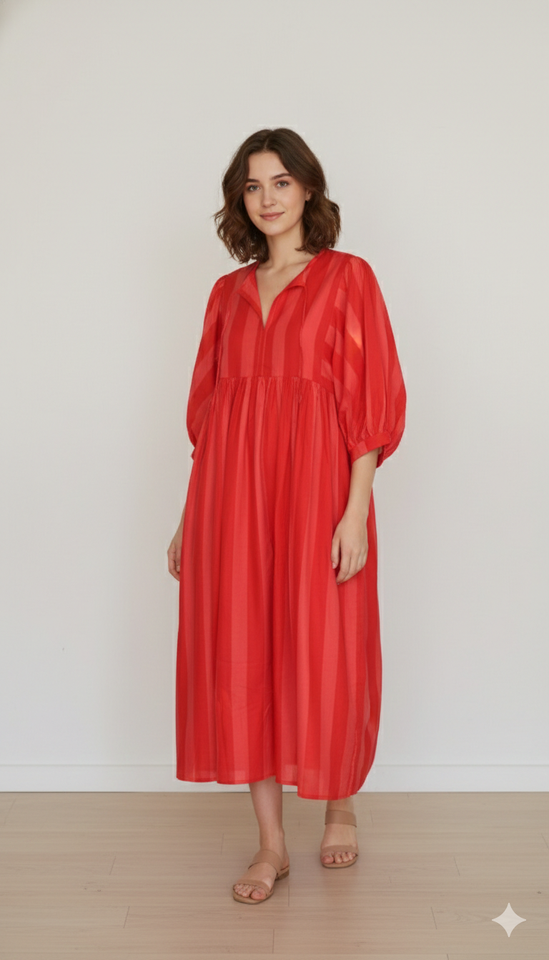 เดรสสั้นผ้าฝ้ายพิมพ์ลายบล็อกสีแดงสำหรับผู้หญิง สไตล์โบโฮ ทรงปกติ เอวธรรมชาติ แขนพอง ใส่สบายๆ สำหรับฤดูร้อน ทรงเอไลน์