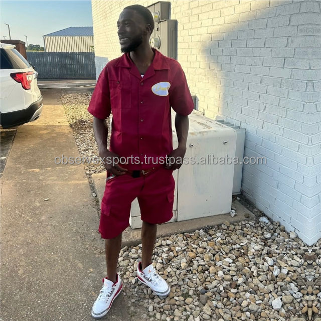 เสื้อเชิ้ตผ้าฝ้ายสีแดงทรงปกติแบบสั่งตัด ชุดสูทสองชิ้นสำหรับผู้ชาย แขนยาว ผ้าทวิลเนื้อนุ่ม ระบายอากาศได้ดี แห้งเร็ว สไตล์วินเทจ