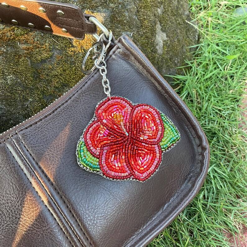 พวงกุญแจเขตร้อนงานปักทำมือกระเป๋ารูปดอกชบาสีแดง