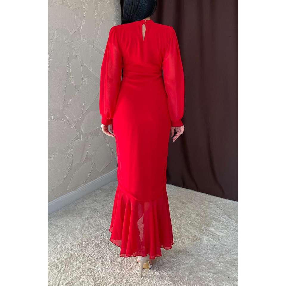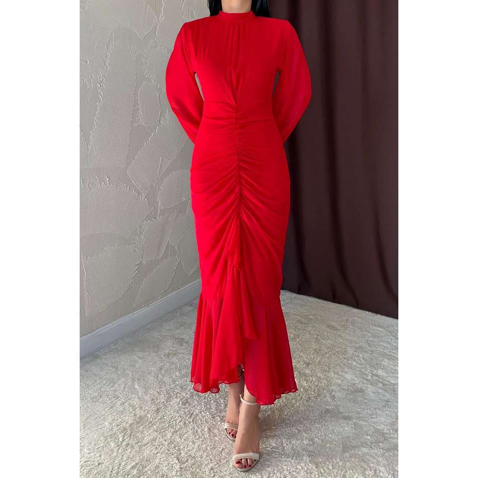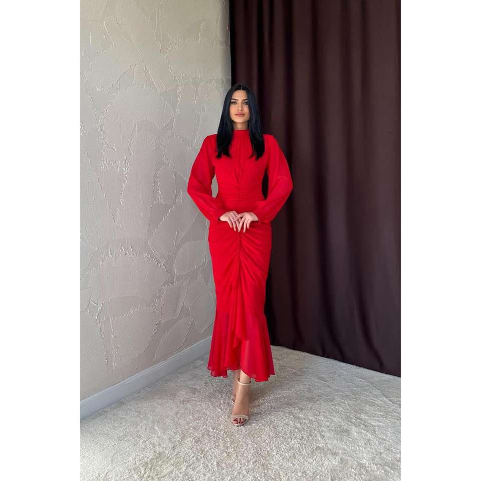 ชุดเดรสผ้าชีฟองคอสูงสีแดงพร้อมระบายช่วงเอวธรรมชาติชุดราตรี