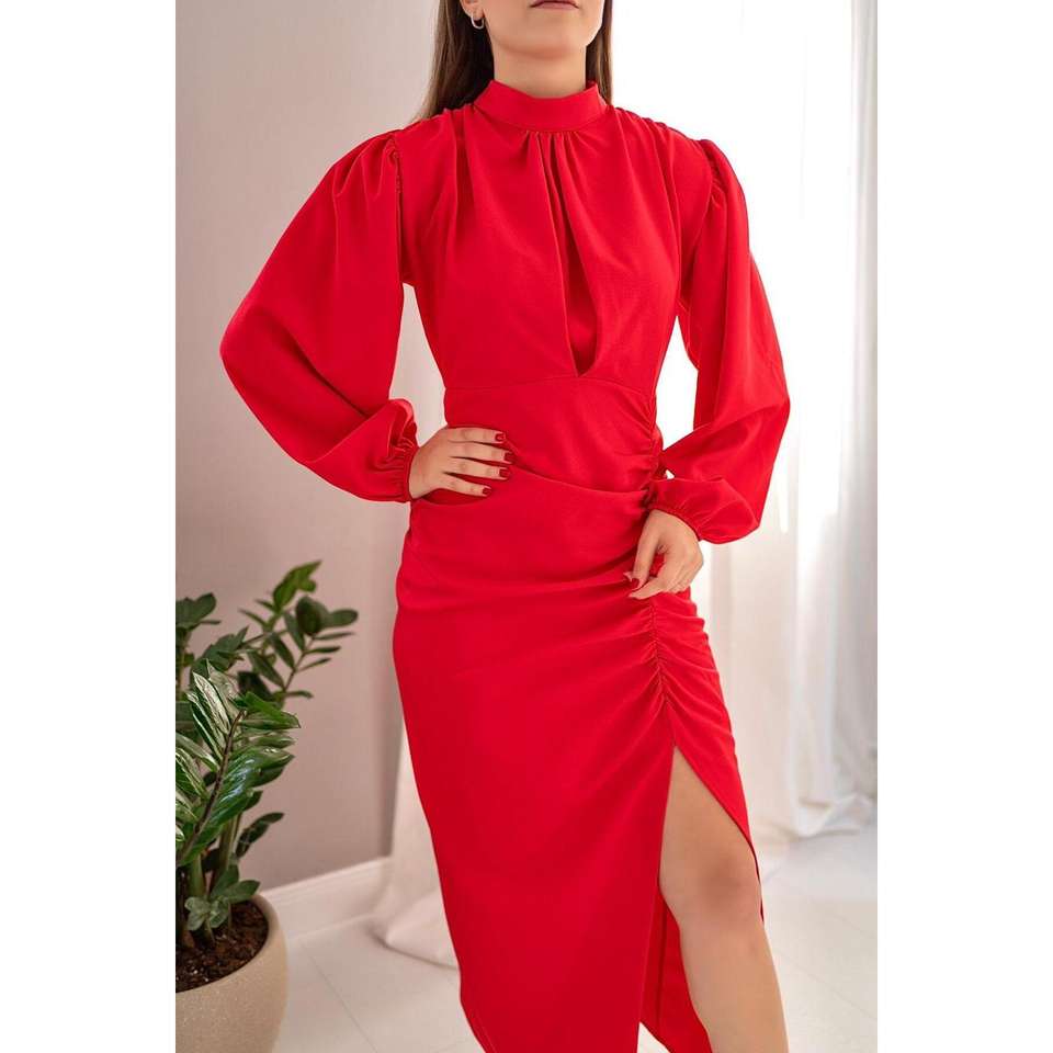 ชุดราตรีสีแดงคอสูงทรงเข้ารูป ผ้าซาติน แต่งระบายด้านหน้าและผ่าข้าง สวมใส่สบาย กระชับเข้ารูปช่วงเอว