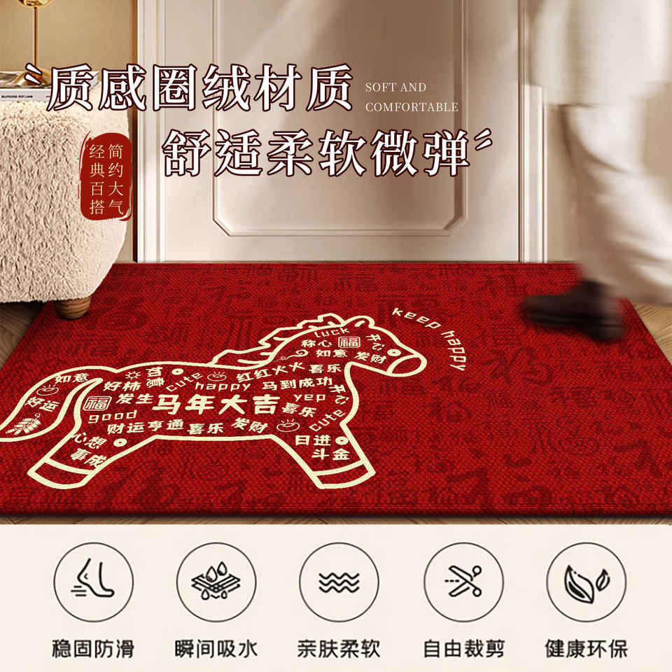พรมเช็ดเท้ารูปม้าสีแดงสำหรับตรุษจีน กันลื่น กำจัดฝุ่น ทนทานต่อการสึกหรอ ทางเข้าบ้าน รูปทรงสี่เหลี่ยมผืนผ้า ซักมือได้