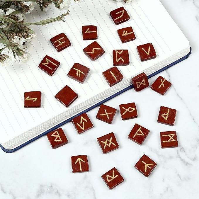 ชุดหินรูนแจสเปอร์สีแดงสลักตัวอักษร Futhark อาวุโสสำหรับการทำนาย-ชุดคริสตัลจิตวิญญาณสำหรับผู้เริ่มต้นและผู้เชี่ยวชาญ