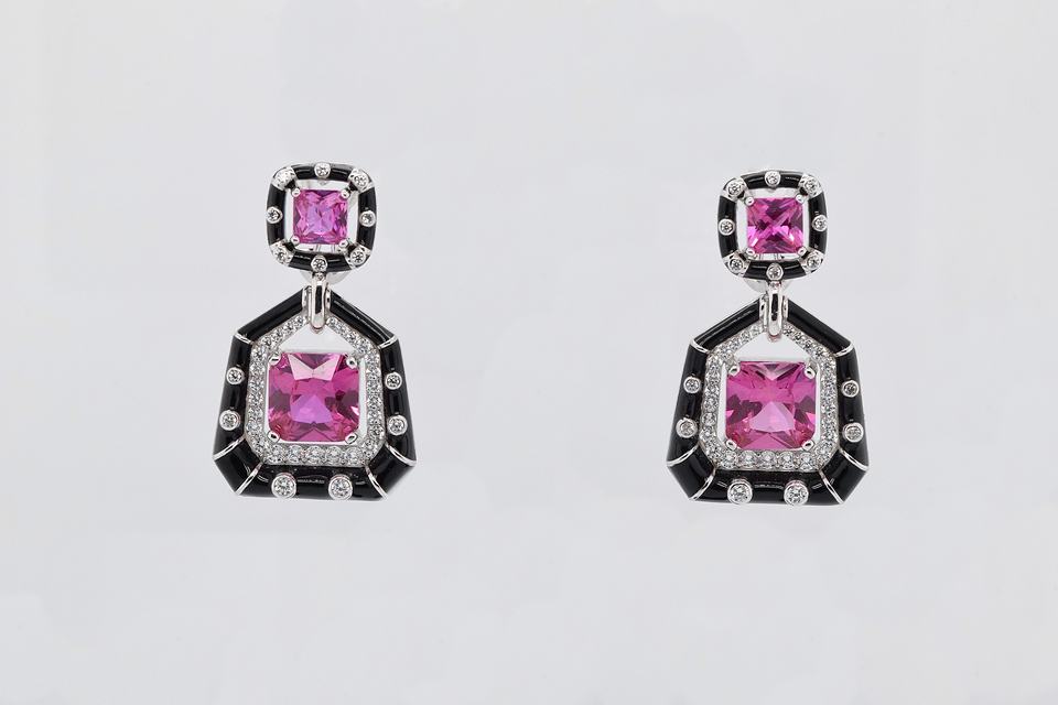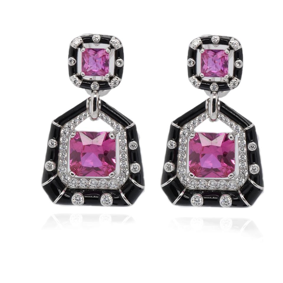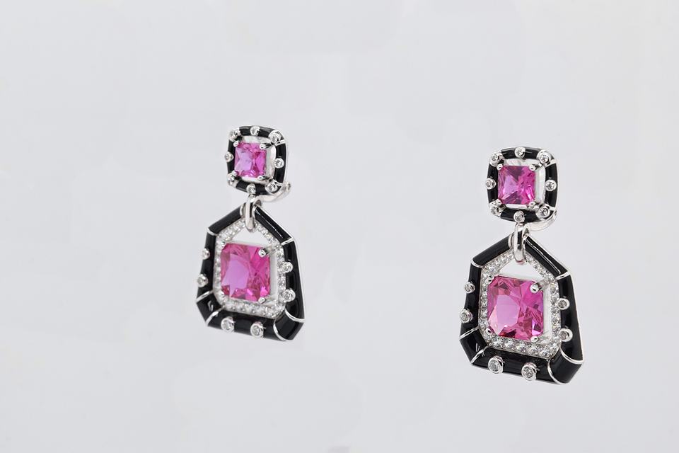 ต่างหูเม็ดกลมแบบอาร์ตเดคโคคู่สุดหรูสีแดง-ของขวัญอินเทรนด์ชุบโรเดียม