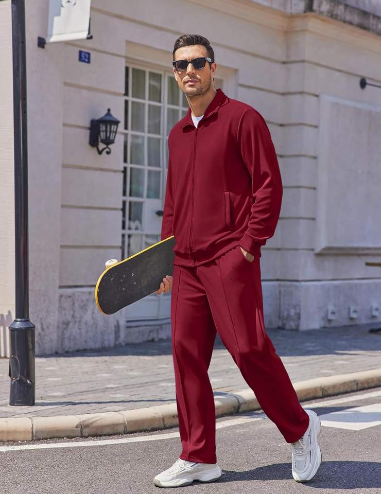 ชุดวอร์มลำลองผู้ชายสีแดง 2 ชิ้น ชุดกีฬาแบบมีซิปเต็มตัว ชุดวิ่งน้ำหนักเบา ผ้าแจ็คการ์ดสีพื้น ชุดออกกำลังกาย เสื้อแจ็คเก็ตและกางเกงแฟชั่น