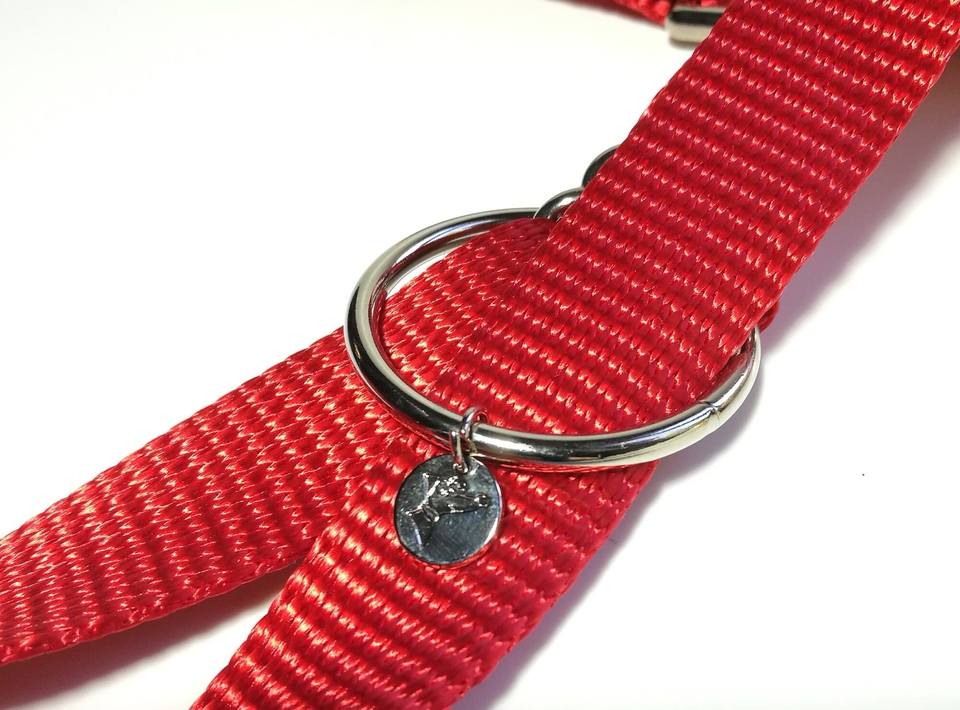 สายจูงสุนัขไนลอนสีแดงแบบวีแกน ปรับความยาวได้ 3 ระดับ กว้าง 3/8-1 นิ้ว ฮาร์ดแวร์สีโรสโกลด์ ทอง หรือเงิน ลายสตรอว์เบอร์รี