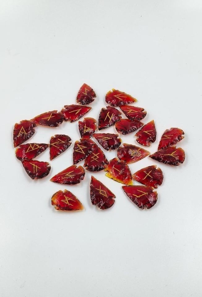 ชุดหินรูนหัวลูกศรโอบซิเดียนสีแดง ชุดรูนคริสตัลฟูทาร์กสวยงาม สไตล์ฮวงจุ้ย แกะสลักด้วยมุนตาฮะอาเกตเพื่อการบำบัด