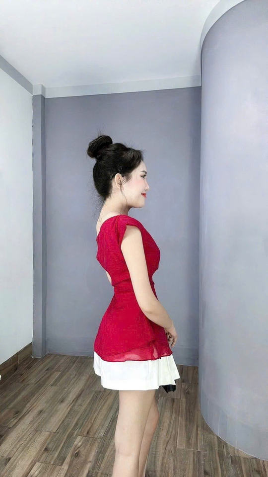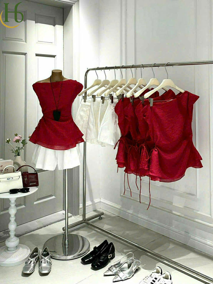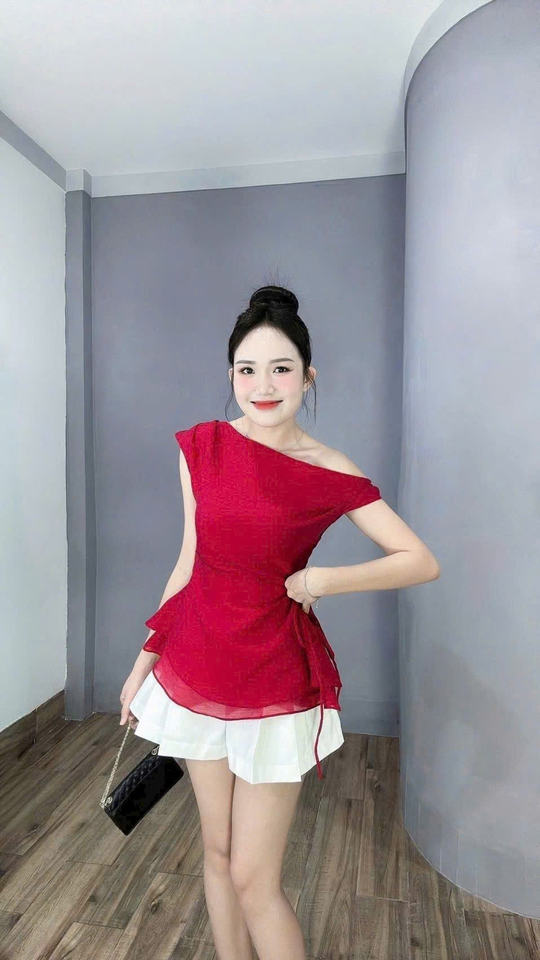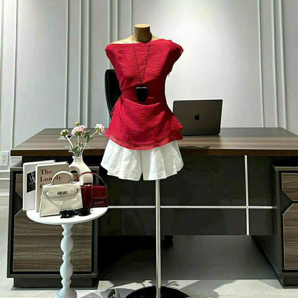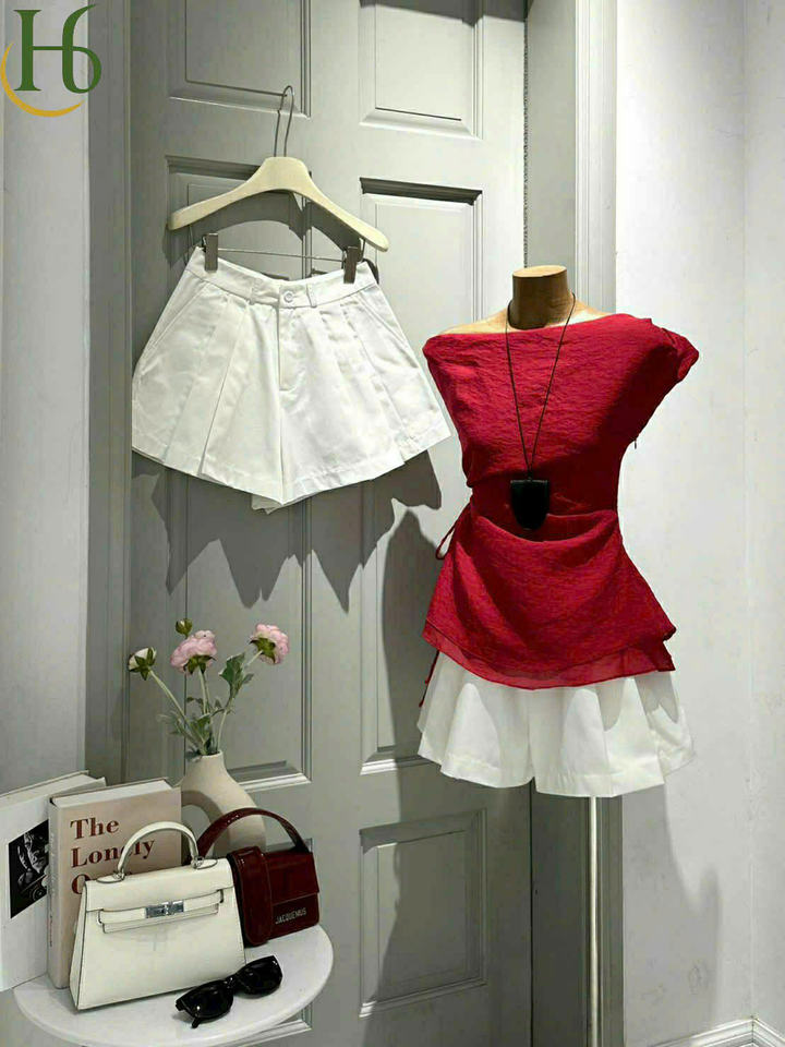 ชุดเสื้อเปิดไหล่ข้างเดียวสีแดงและกางเกงขาสั้นสีขาว สไตล์เวียดนาม สวยสง่า ดูเป็นผู้หญิง ชุดสองชิ้นแบบไม่มีแขนและไม่มีปก