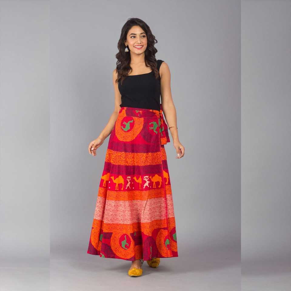 กระโปรงแมกซี่พิมพ์ลายชนเผ่าสีแดงส้มส้มแดงสไตล์ห่อทางการผ้าฝ้ายปักลายดอกไม้แบบดิจิตัลระบายอากาศได้ดีสำหรับใส่ทำงาน