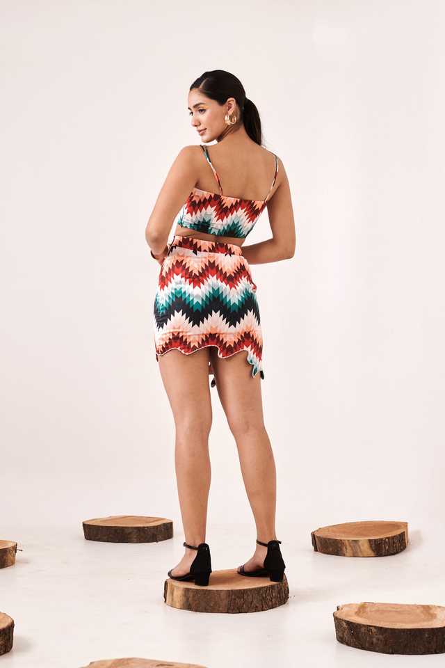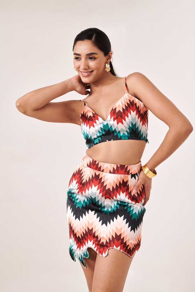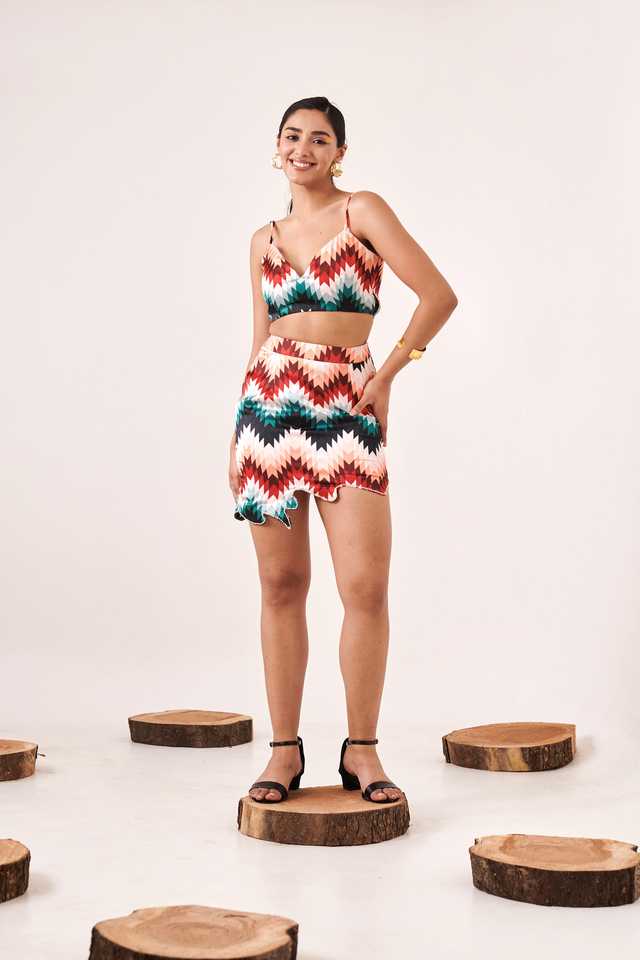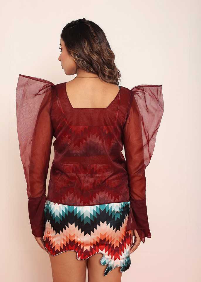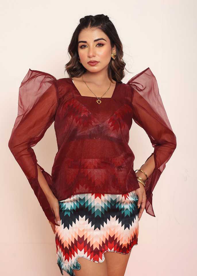 ชุดเซ็ตทูพีซผ้าออร์แกนซ่าสีแดง ท่อนบนทรงกิ๊กอตพร้อมลายพิมพ์และกระโปรง ดีไซน์เก๋ไก๋มีสไตล์ พร้อมเลเยอร์สุดหรู ดูทันสมัย