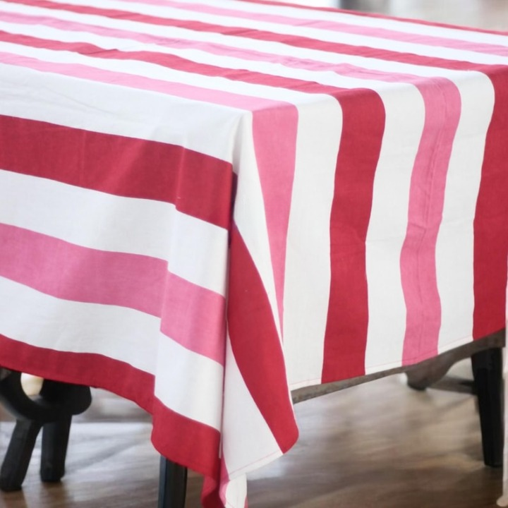ผ้าปูโต๊ะลายทางสีแดง ชมพู และขาว ผ้าปูโต๊ะอินเดีย ผ้าปูโต๊ะลายทาง