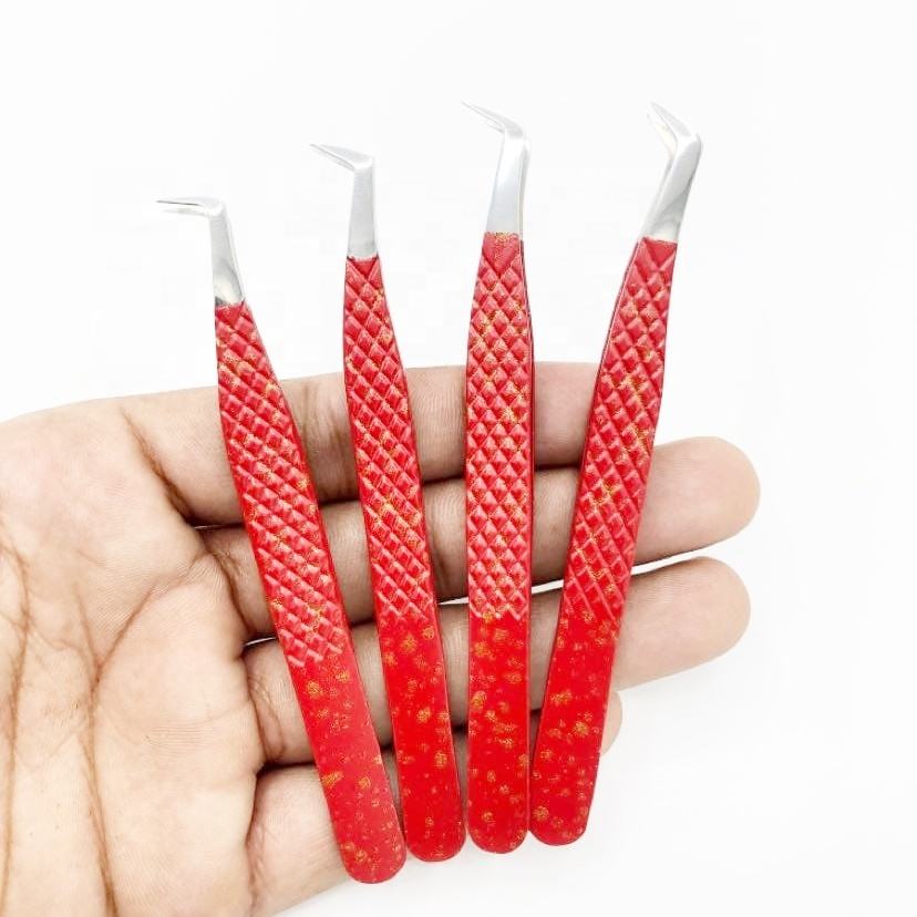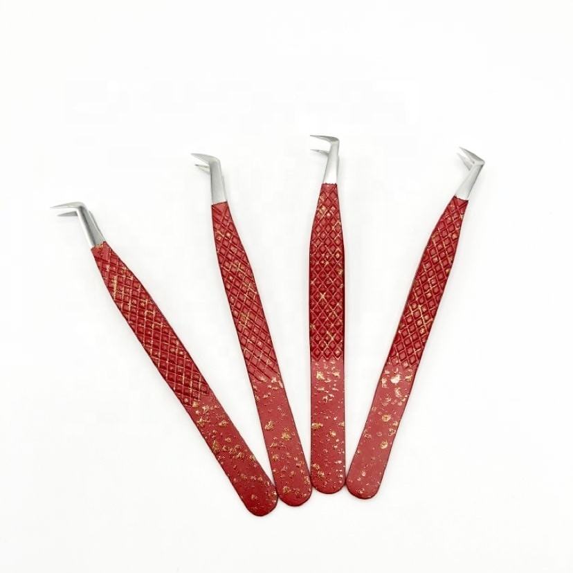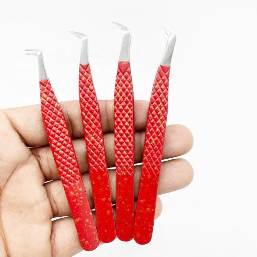 คีมหนีบขนตาสแตนเลสสีแดงเคลือบด้วยผงออกแบบโลโก้ได้ตามต้องการมีเพชรแหลมสีทองประกายออกแบบอย่างยั่งยืน