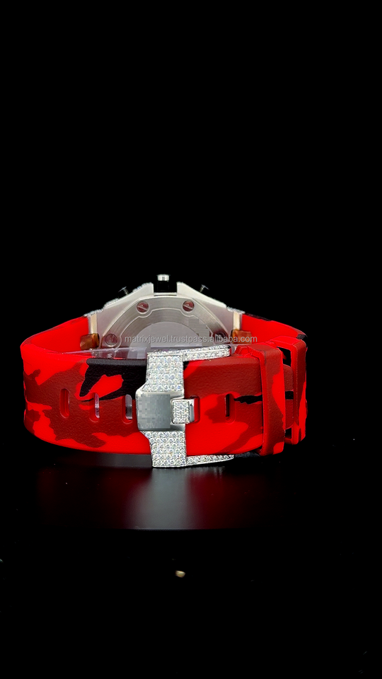 สายยางสีแดง นาฬิกาโมอิสซาไนต์คุณภาพพรีเมียมแบบครึ่งฝังเพชร พร้อมใบรับรองจากเครื่องตรวจสอบเพชร มาพร้อมกล่อง