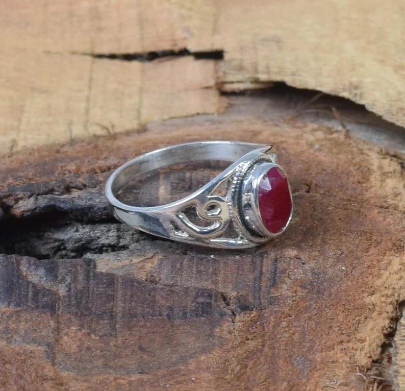แหวนพลอยทับทิมสีแดง925เงินสเตอร์ลิงรูปวงรีแหวนดีไซน์เนอร์แฮนด์เมดของขวัญคริสต์มาสทำมือวันเกิด